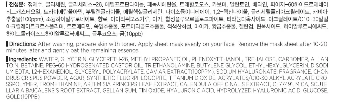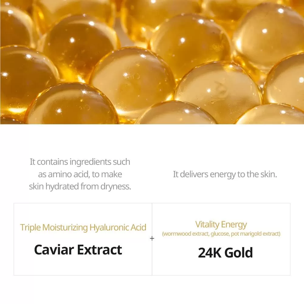JMsolution Active Golden Caviar Nourishing Mask vil gi huden en sunn fasthet og tilføre den med masse næring takket være ekstrakt fra kaviar og 24k gull. Ekstrakten fra kaviar inneholder rikelig med proteiner, aminosyrer og flerumettet fettsyrer. En ansiktsmaske som styrker hudbarrieren og vil forbedre hudteksturen.