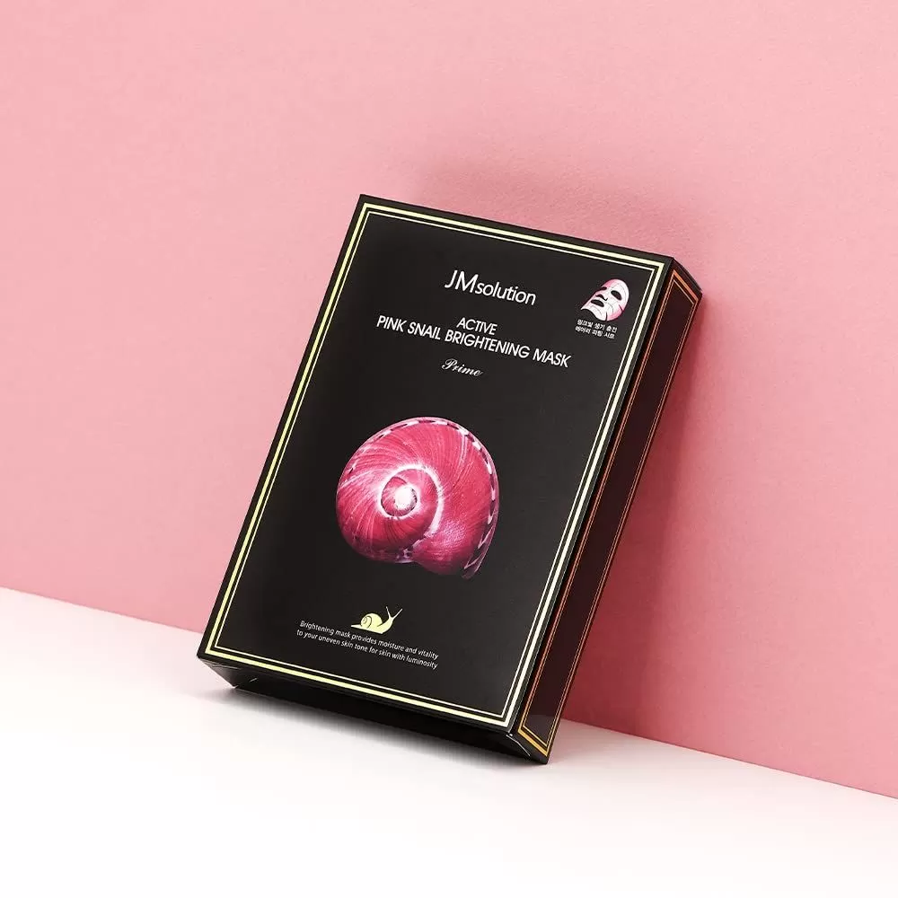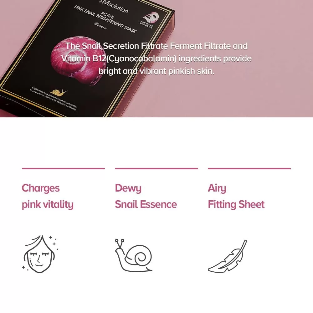 JMsolution Active Pink Snail Brightening Mask vil gi huden vitalitet, glød og gjøre den strålende takket være den rosa sneglesekret essensen og Vitamin B12 (cyanokobalamin). Essensen i denne ansiktsmaksen vil lett absorberes av huden og gi en klar og jevn hudtone.