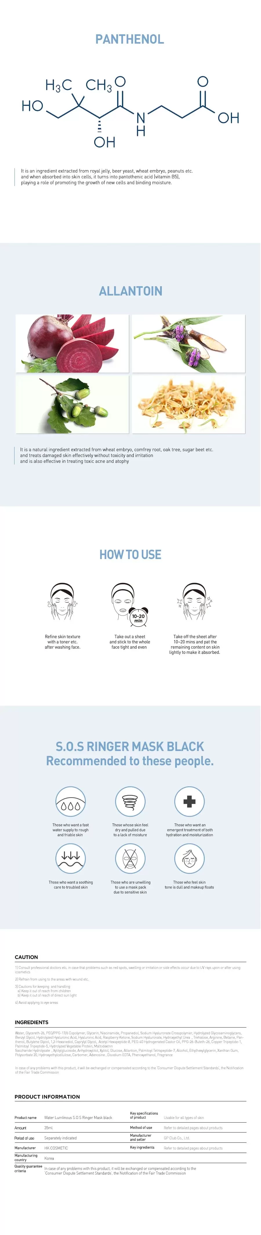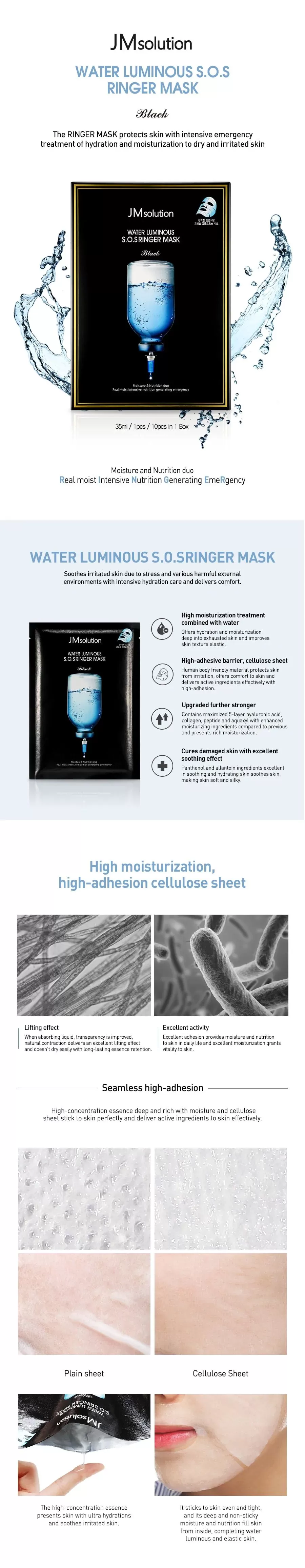 JMsolution Water Luminous S.O.S Ringer Mask vil fukte huden din fullstendig og berolige huden. Inneholder hyaluronsyre, kollagen, peptider og aquaxyl vil sammen gi huden spenst, forbedre dens elastisitet og gi den rikelig med fukt. Fri for parfyme, mineralolje og alkohol.
