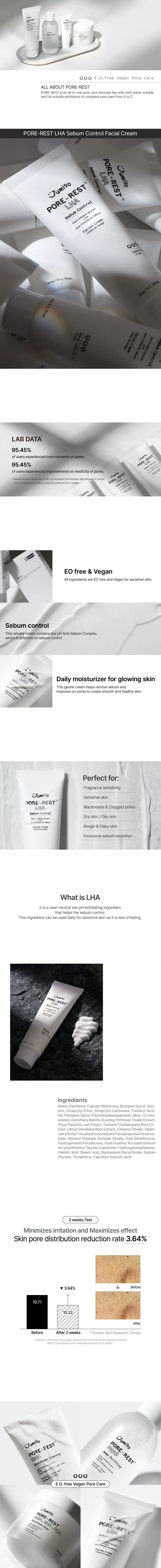 Jumiso PORE-REST LHA Sebum Control Facial Cream er en sensitiv fuktighetskrem som inneholder en lav pH anti-sebum complex (eksfolierende LHA) som vil hjelpe huden å balansere talg produksjonen. Fri for Alkohol, EO, parfyme og er Vegansk.