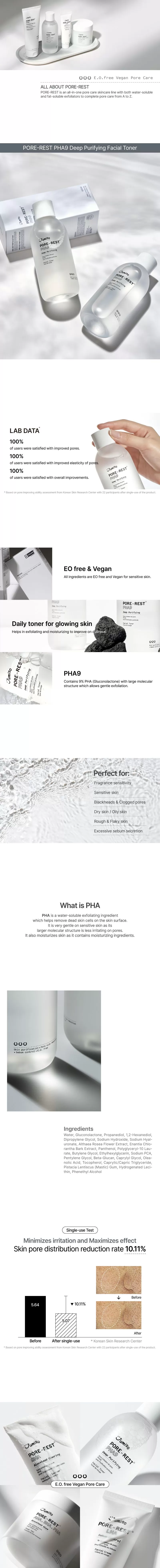 Jumiso PORE-REST PHA 9 Deep Purifying Facial Toner inneholder 9% PHA (Gluconolactone) med en stor-molekyl struktur som vil skånsom eksfoliere huden. PHA er en vannløselig eksfolierende ingrediens som hjelper å fjerne døde hudceller fra hudoverflaten, PHA er skånsom mot huden takket være sin store molekyl struktur, i tillegg vil den tilføre huden fuktighet. Utviklet for å redusere størrelsen på porene og forhindre irritasjon i huden. Inneholder ikke EO eller parfyme og er Vegansk.