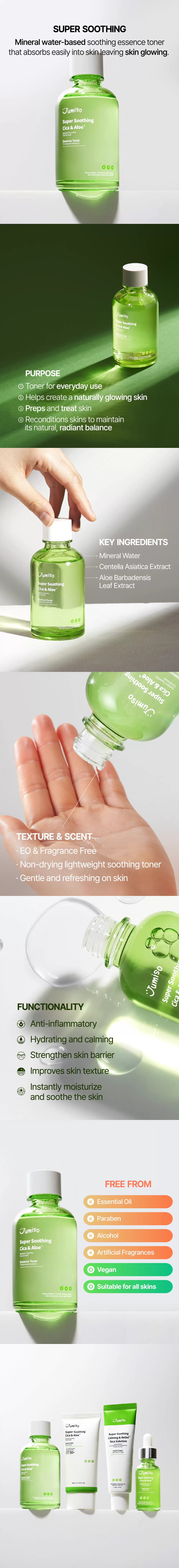 Jumiso Super Soothing CIca & Aloe Essence Toner er en beroligende og fuktighetsgivende toner, denne essens-toneren bruker mineralvann som har en mindre molekylstruktur enn vanlig vann og er derfor effektiv i å føre de aktive ingrediensene inn i huden. Denne toneren vil effektivt fukte, styrke hudbarrieren og berolige huden ved hjelp av Centella Asiatica og Aloe Barbadensis Leaf juice. Alt i alt en frisk essens-toner som har følgende egenskaper: anti-inflammatorisk, hydrerende og beroligende. Inneholder EWG grønne ingredienser, er fri for alkohol og kunstige dufter, denne essens-toneren er Vegansk.