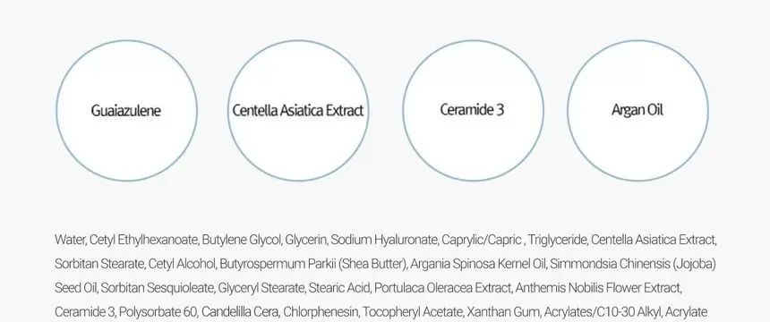 Guaiazulene, er en urt som utvinnes av Kamomille. Urten har beroligende og kjølende egenskaper på betent og skadet hud, og påvirker hudens fornyelse. Denne unike ingrediensen brukes også mye i japansk hudpleie, og er hovedingrediensen i mange salver for brannskader.