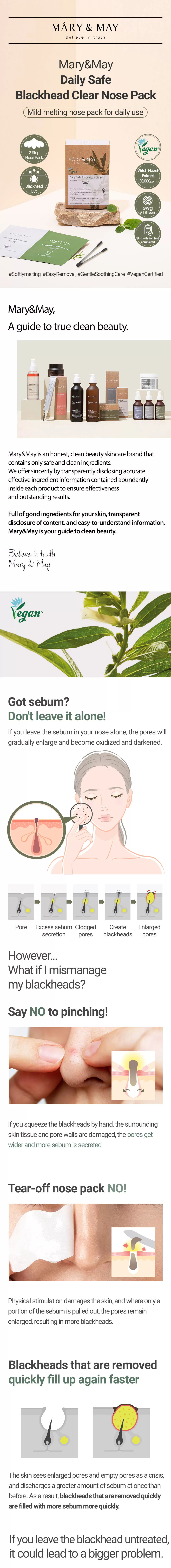 Mary & May Daily Safe Blackhead Clear Nose Pack er en mild 2-stegs nese maske som vil fjerne "blackheads" og minste synligheten av porene. Steg 1 inneholder Witch Hazel, Salvia Leaf, Niacinamide og White Willow Bark (BHA) som sammen vil dyprense porene og eksfoliere huden. Steg 2 inneholder Centella asiatica, Houttuynia cordata, Tea tree leaf og 5 typer peptider som sammen vil berolige huden samt hjelpe porene å trekke seg sammen.
