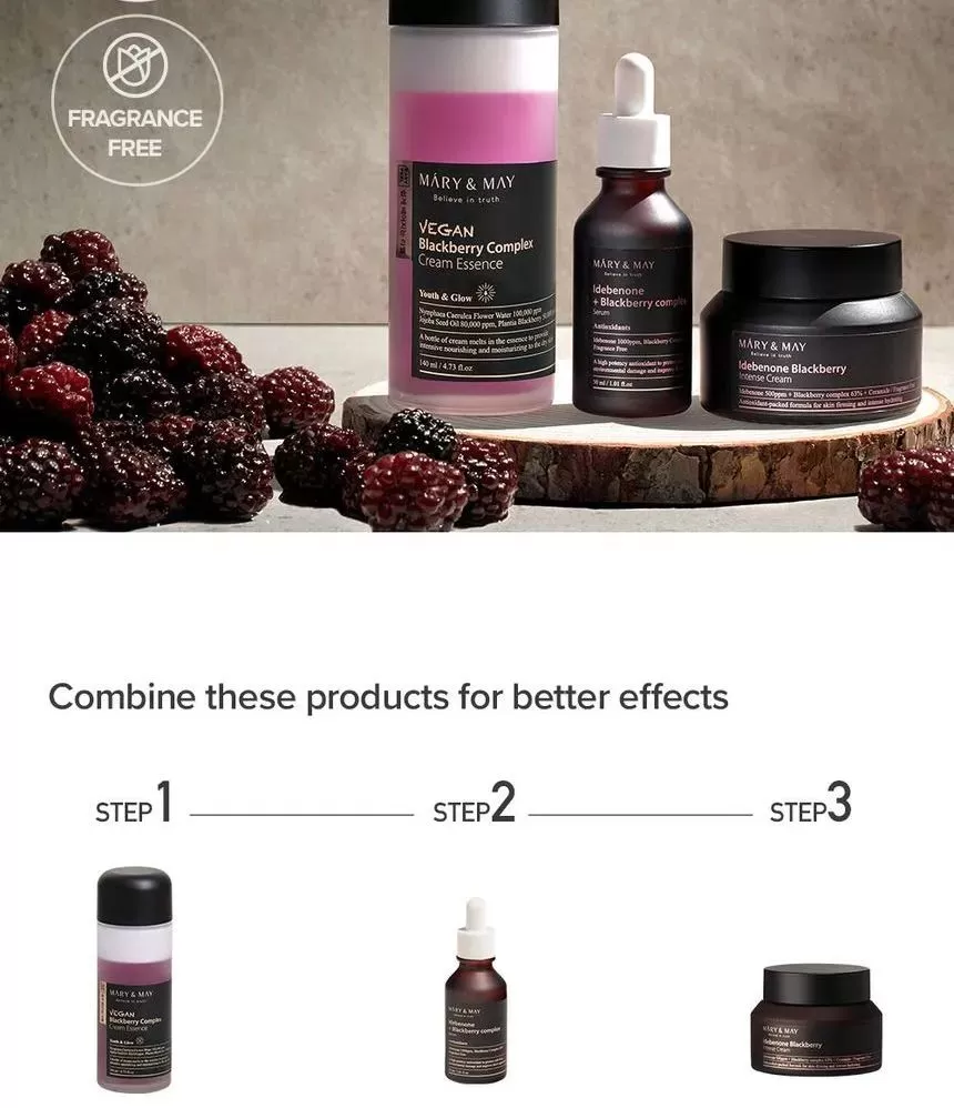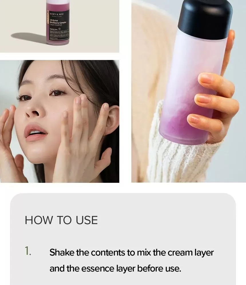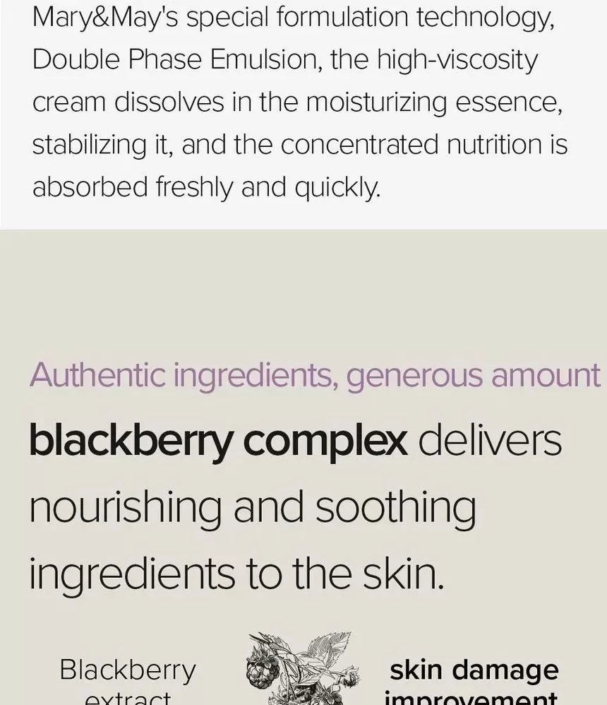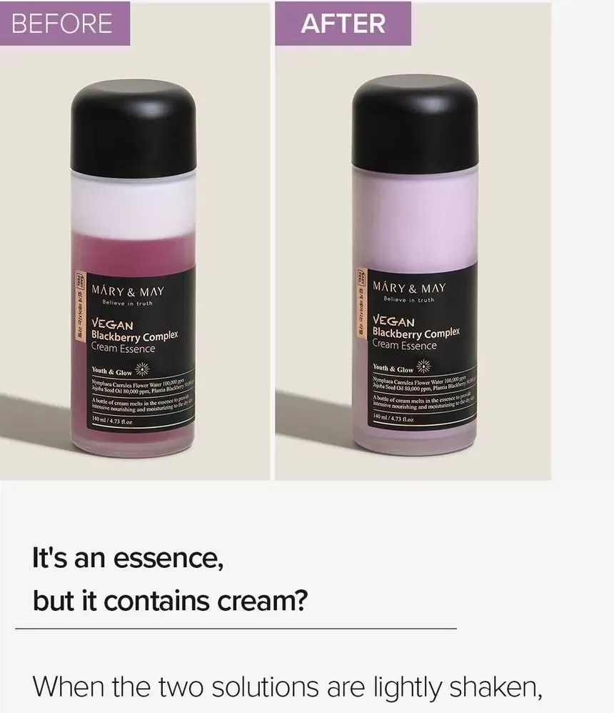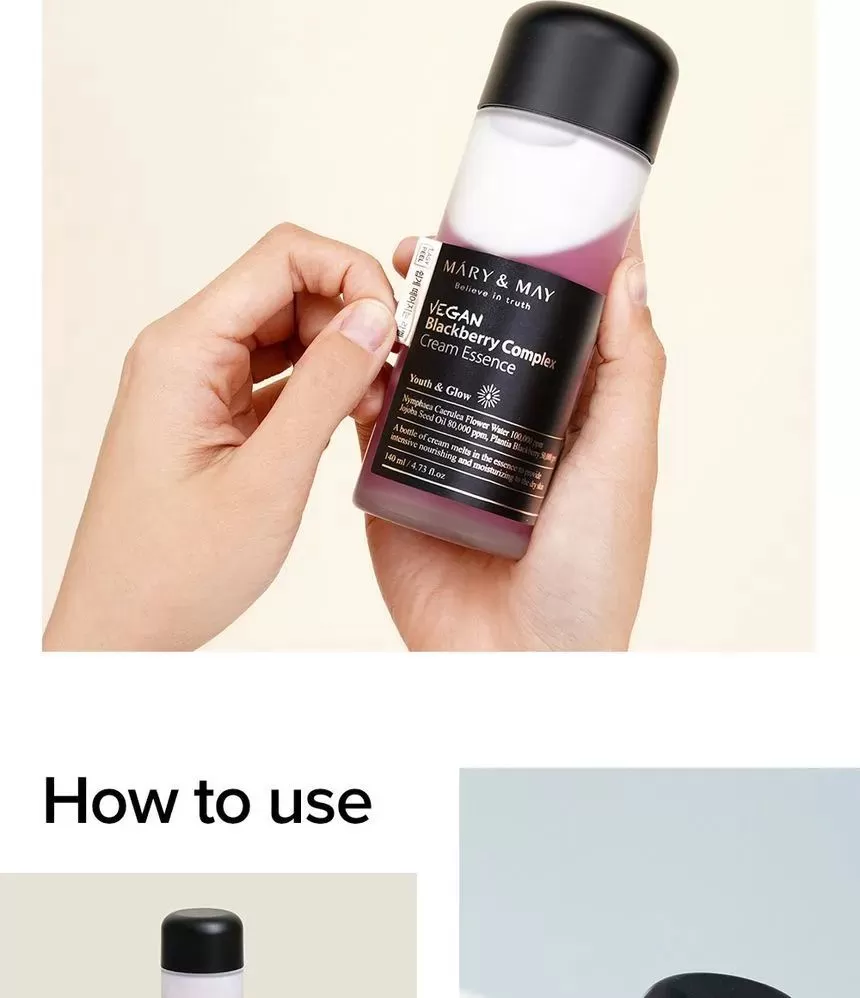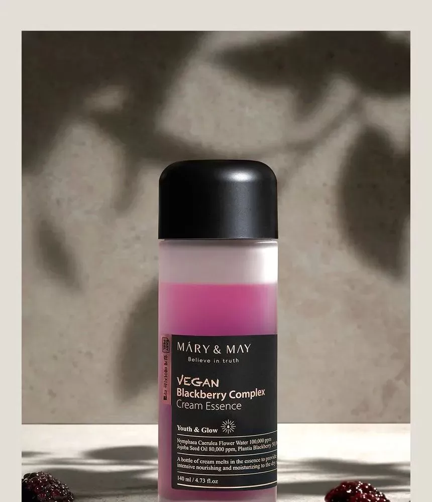 Mary & May Vegan Blackberry Complex Cream Essence er en næringsrik krem i form av en essens, en flaske med "krem" som vil tilføre huden rikelig med næring og fukt.