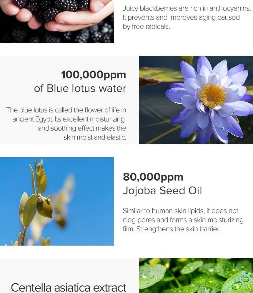 4. 100.000 ppm Blå lotusvann: Den blå lotusen kalles livets blomst i det gamle Egypt. Dens utmerkede fuktighetsgivende og beroligende effekt gjør huden både fuktig og gir den elastisitet.