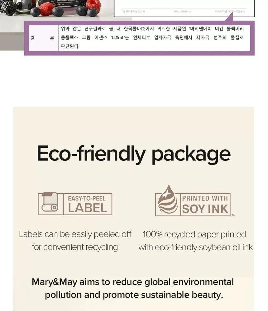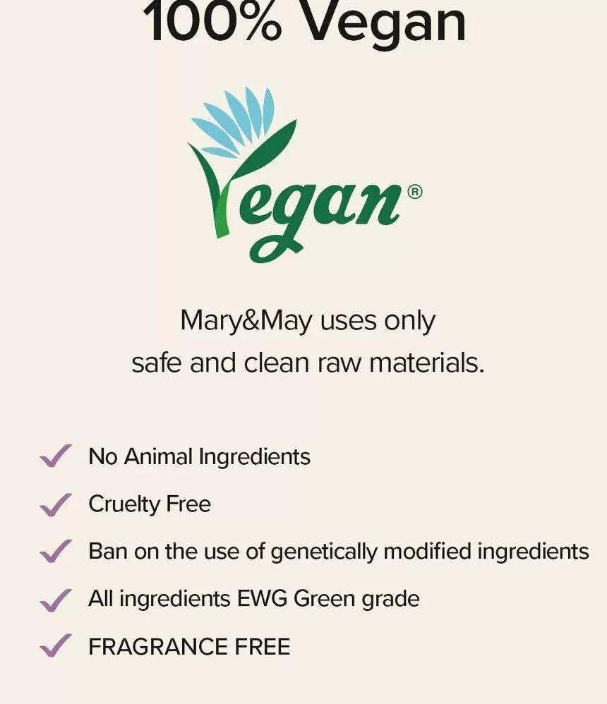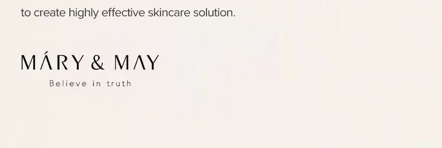 Mary & May er en clean beauty brand fra Sør-Korea som alltid er åpen om bruk av ingredienser og hvor mye av nøkkelingredienser produktene inneholder, Mary & May har strenge retningslinjer som forbyr testing på dyr og de er nøye på å bruke rene høykvalitets EWG ingredienser som ikke irriterer huden. Dette varemerket står for en mest mulig miljøvennlig produkt, der produktene er pakket inn i resirkulert materiale og informasjon er printet med soyablekk som er naturlig nedbrytbar. Mary & May sine produkter er cruelty-free (produsert på en dyrevennlig måte) og laget med følgende tankegang; "De beste produktene er laget med know-how og tilstrekkelig mengde aktive ingredienser, med transparent innholdsbetegnelse som er lett å forstå til en fornuftig pris"