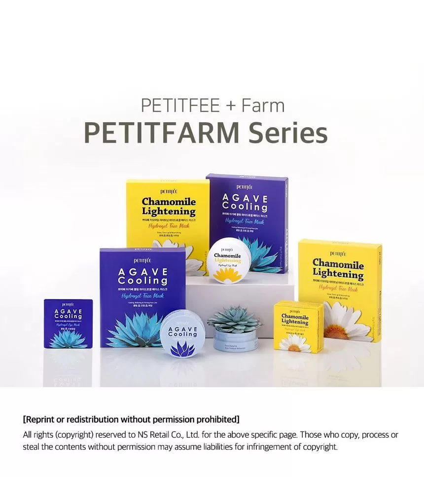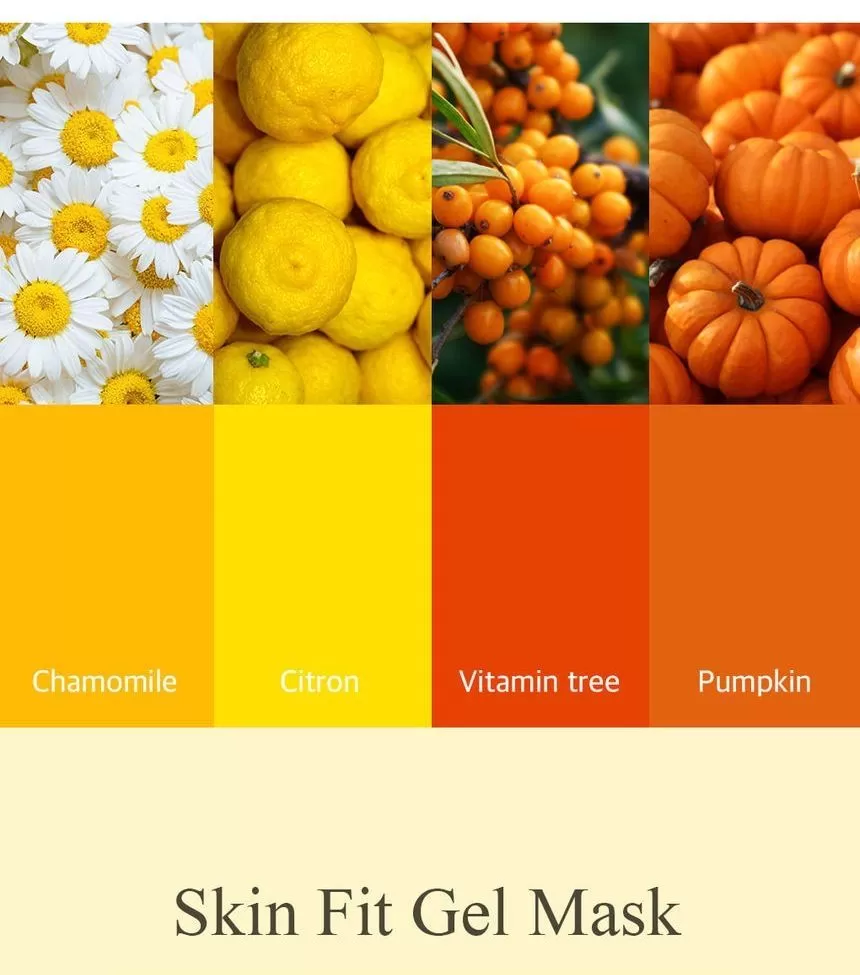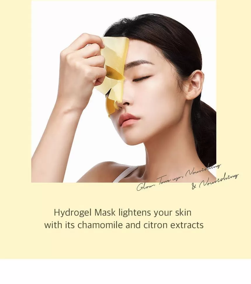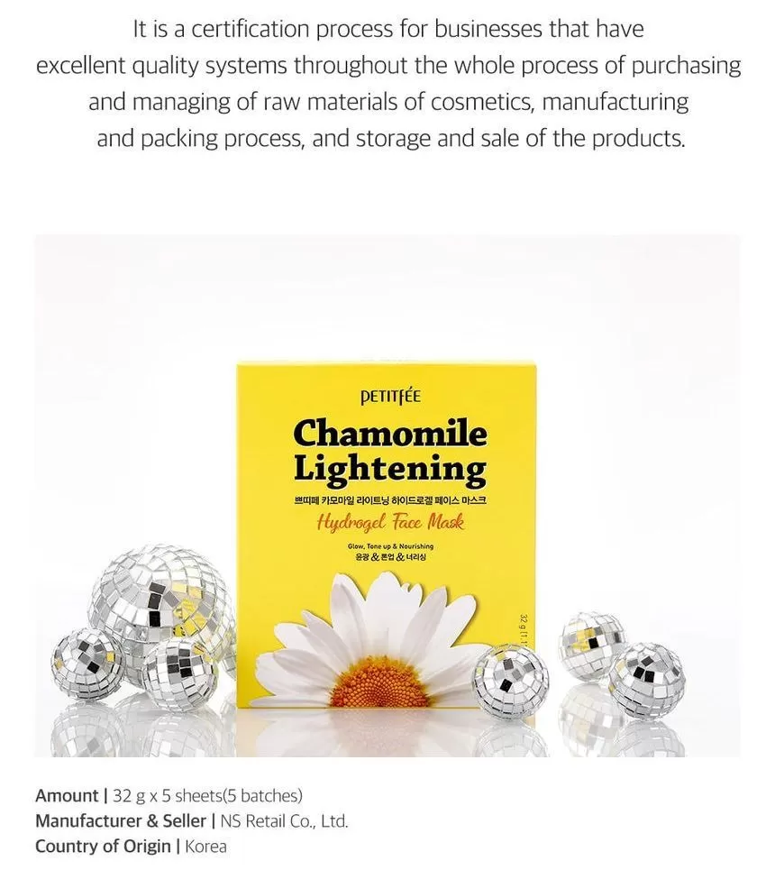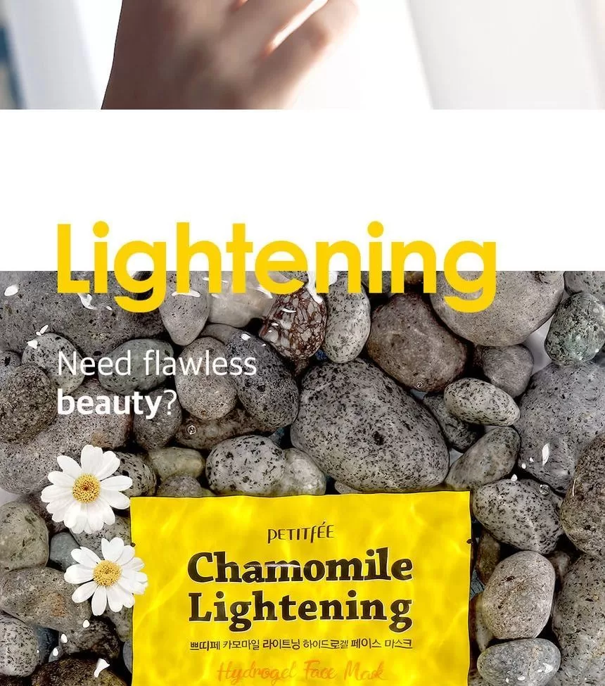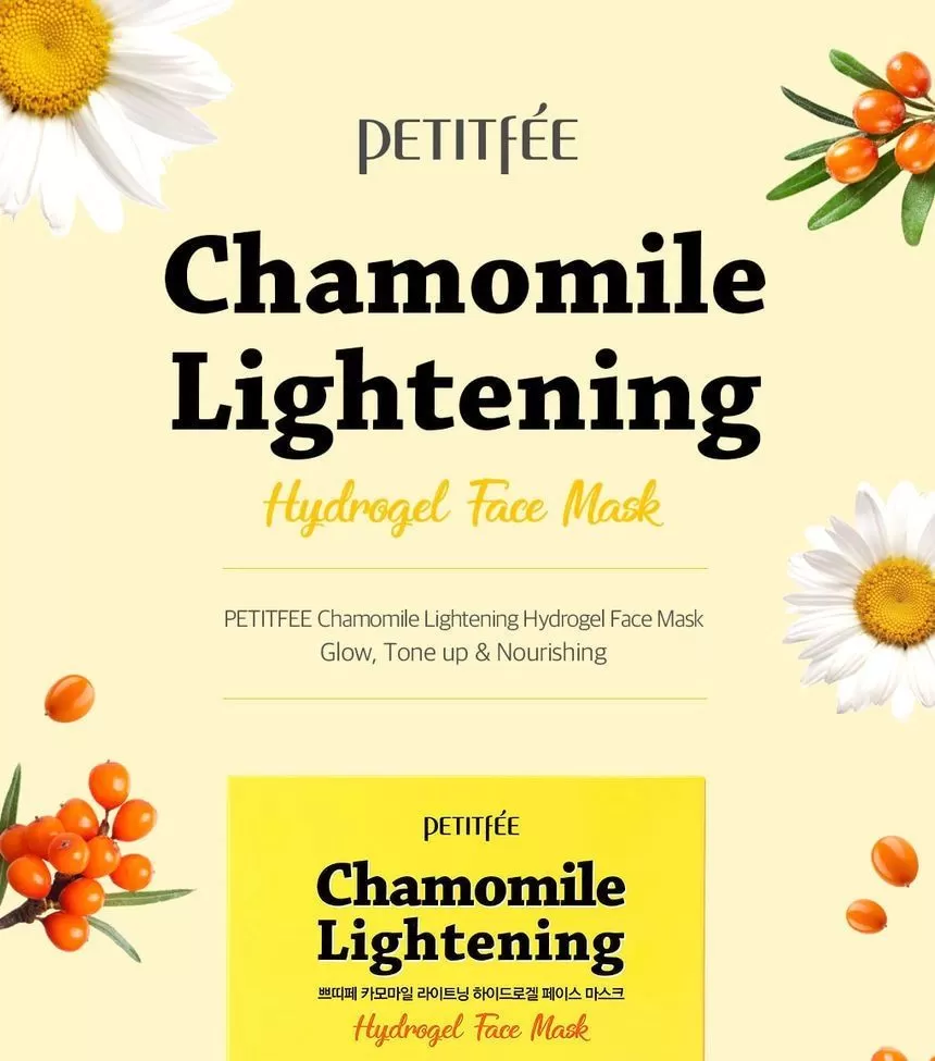 Petitfee Chamomile Lightening Hydrogel Face Mask er en ansiktsmaske (sheet-mask) laget av hydrogel og er formulert med ekstrakt fra kamille, yuja og gresskar. Yuja er rik på Vitamin-C som jevner ut hudtonen. Kamille ekstrakt vil berolige og fukter huden. Gresskar vil gi huden mer spenst og er et kjent well-aging ingrediens. En maske som vil gi god pleie til matt, slapp og sliten hud. Kommer i 2 deler (overdel for toppen av ansiktet og bunn-del for hake og kinn) - la virke i 10-20minutter, klapp overflødig essens inn i huden etter masken er tatt av.