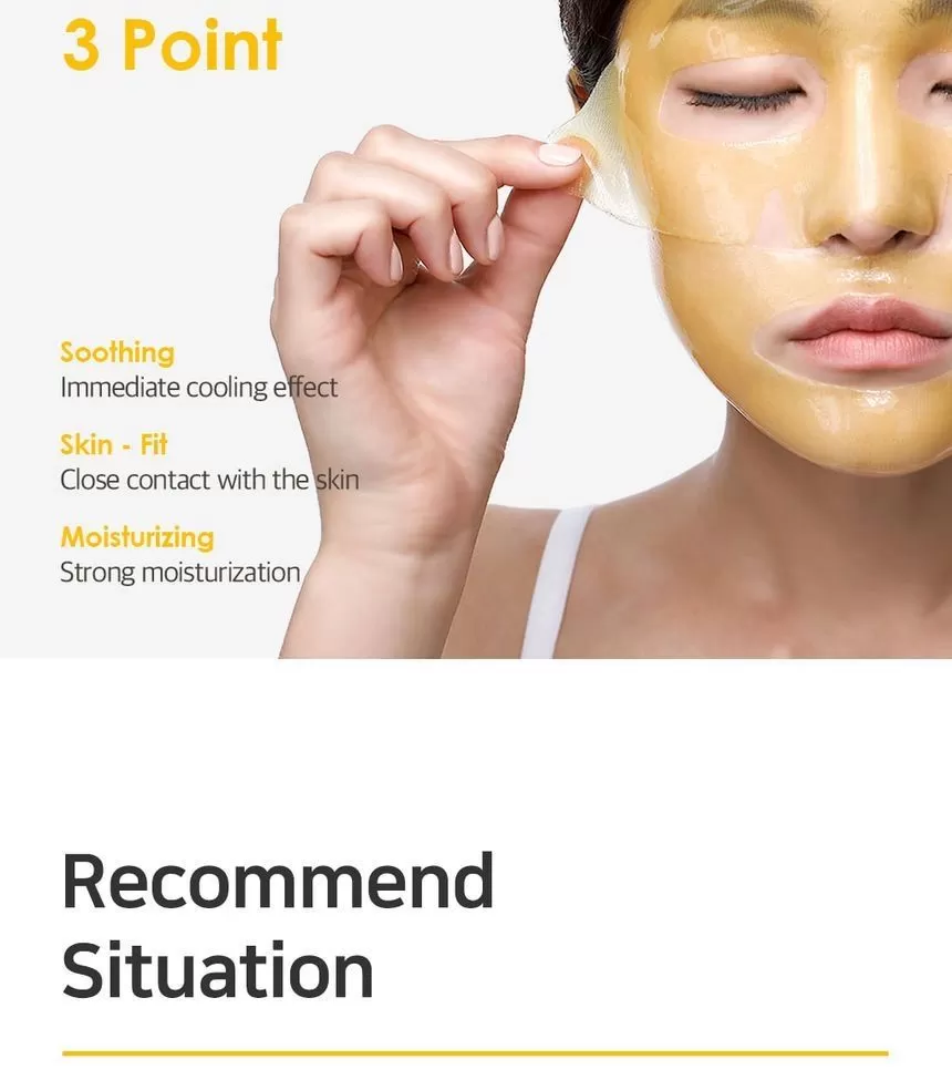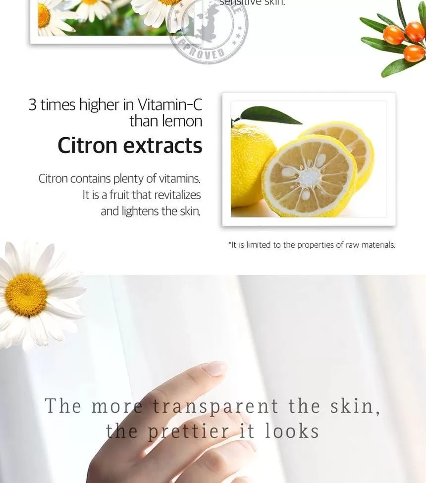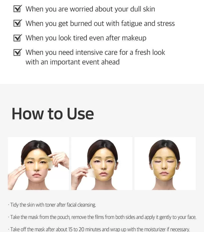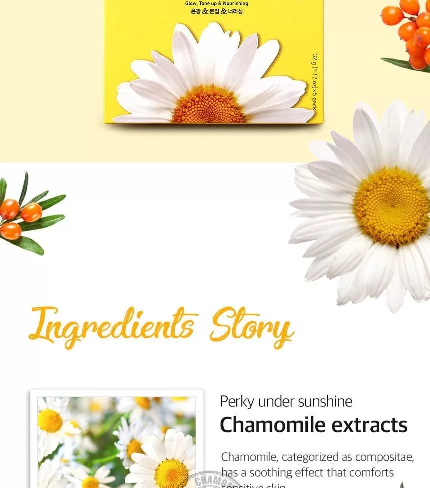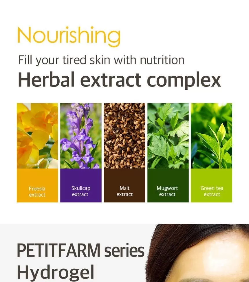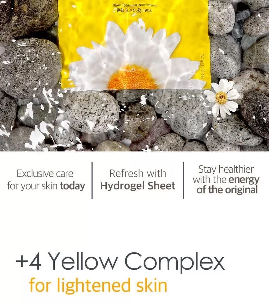 Petitfee Chamomile Lightening Hydrogel Face Mask er en ansiktsmaske (sheet-mask) laget av hydrogel og er formulert med ekstrakt fra kamille, yuja og gresskar. Yuja er rik på Vitamin-C som jevner ut hudtonen. Kamille ekstrakt vil berolige og fukter huden. Gresskar vil gi huden mer spenst og er et kjent well-aging ingrediens. En maske som vil gi god pleie til matt, slapp og sliten hud. Kommer i 2 deler (overdel for toppen av ansiktet og bunn-del for hake og kinn) - la virke i 10-20minutter, klapp overflødig essens inn i huden etter masken er tatt av.