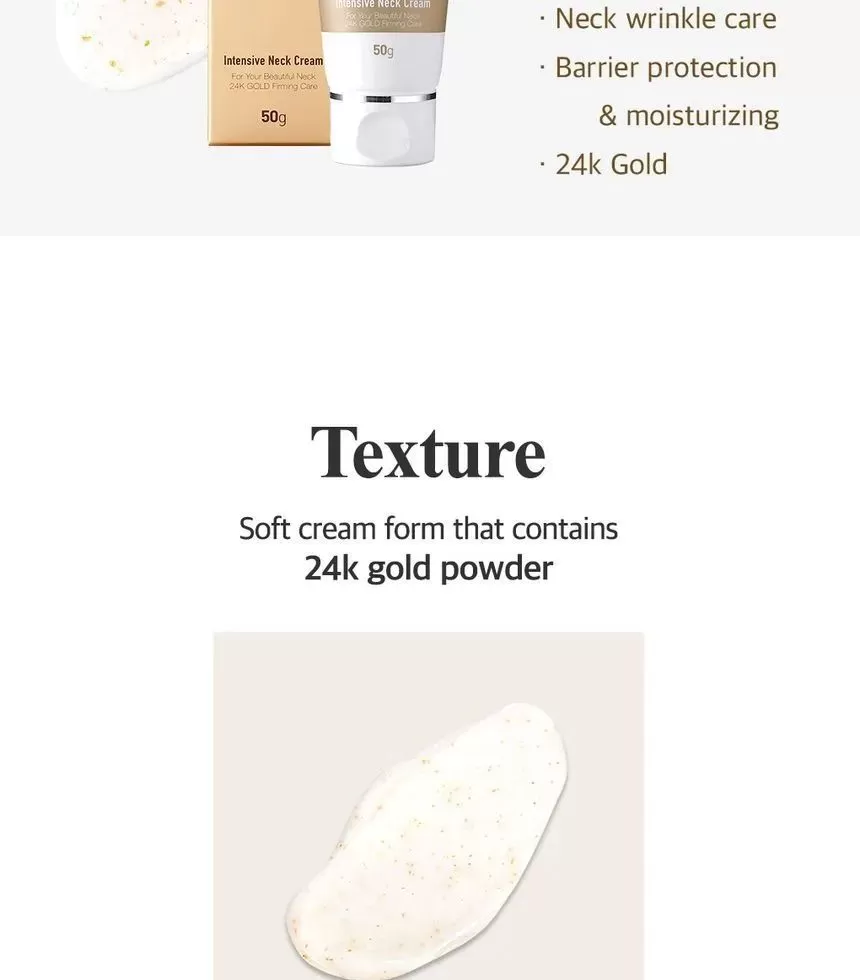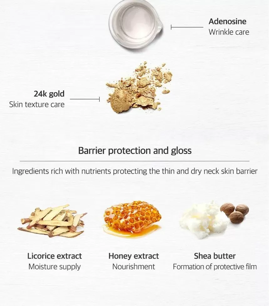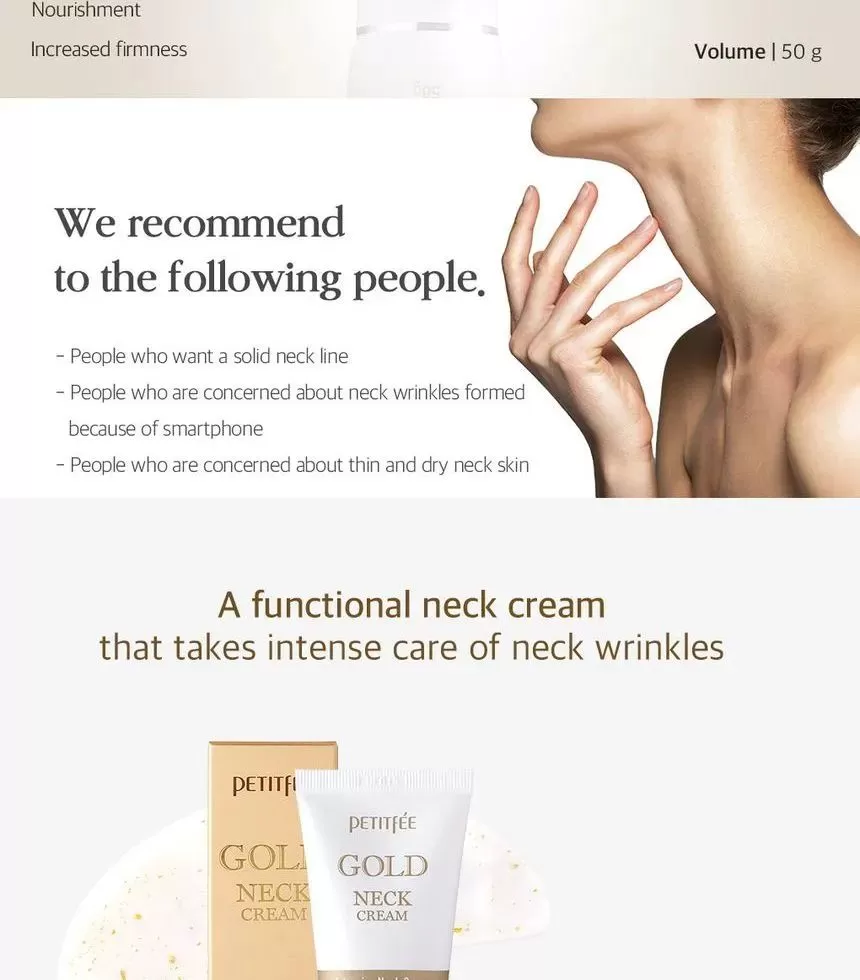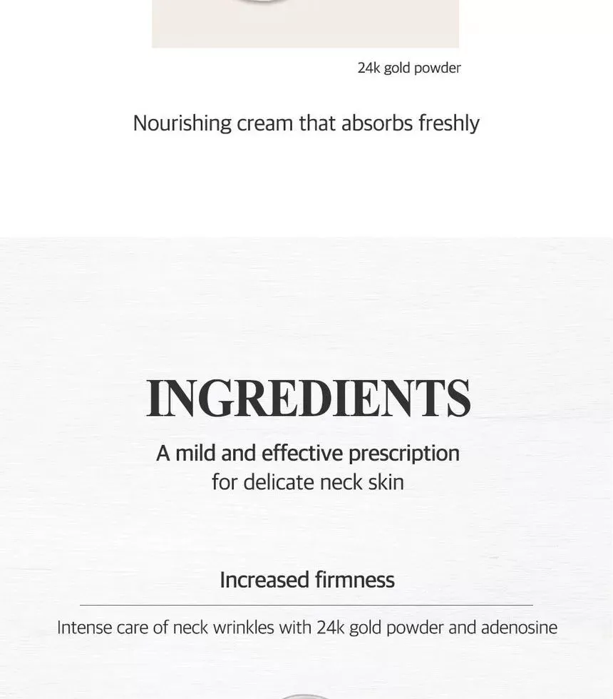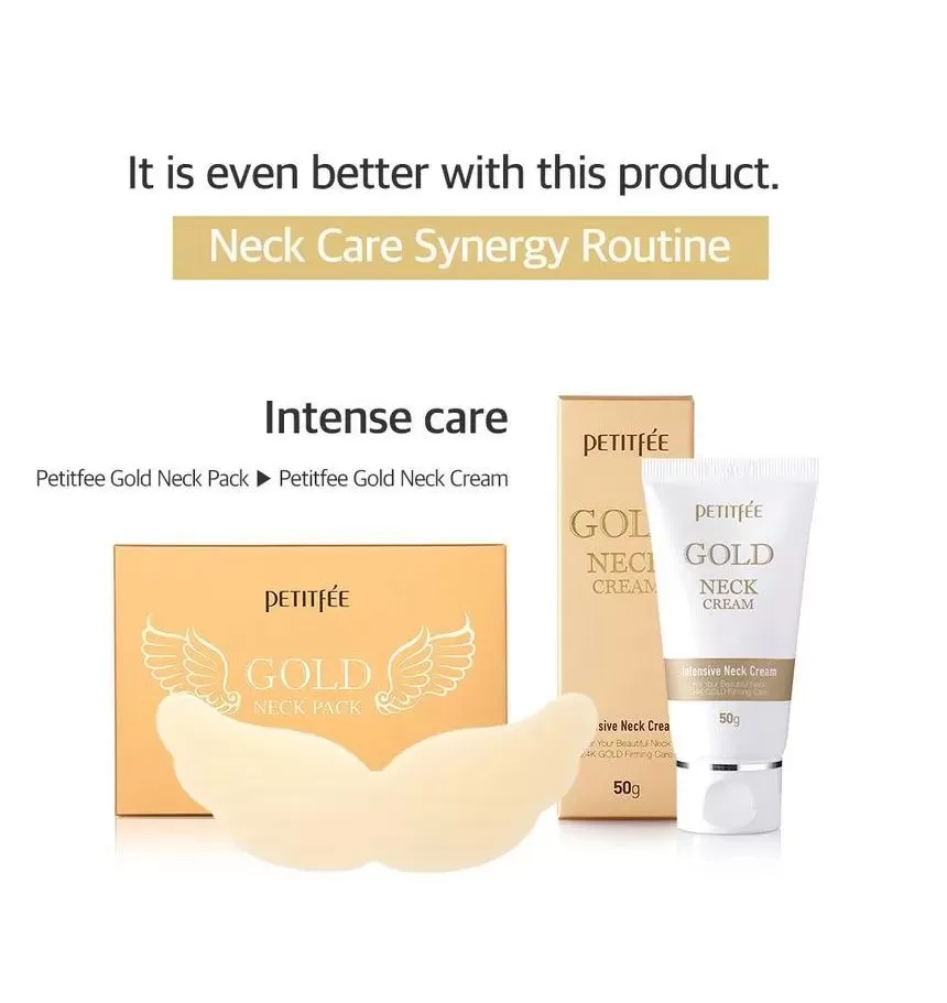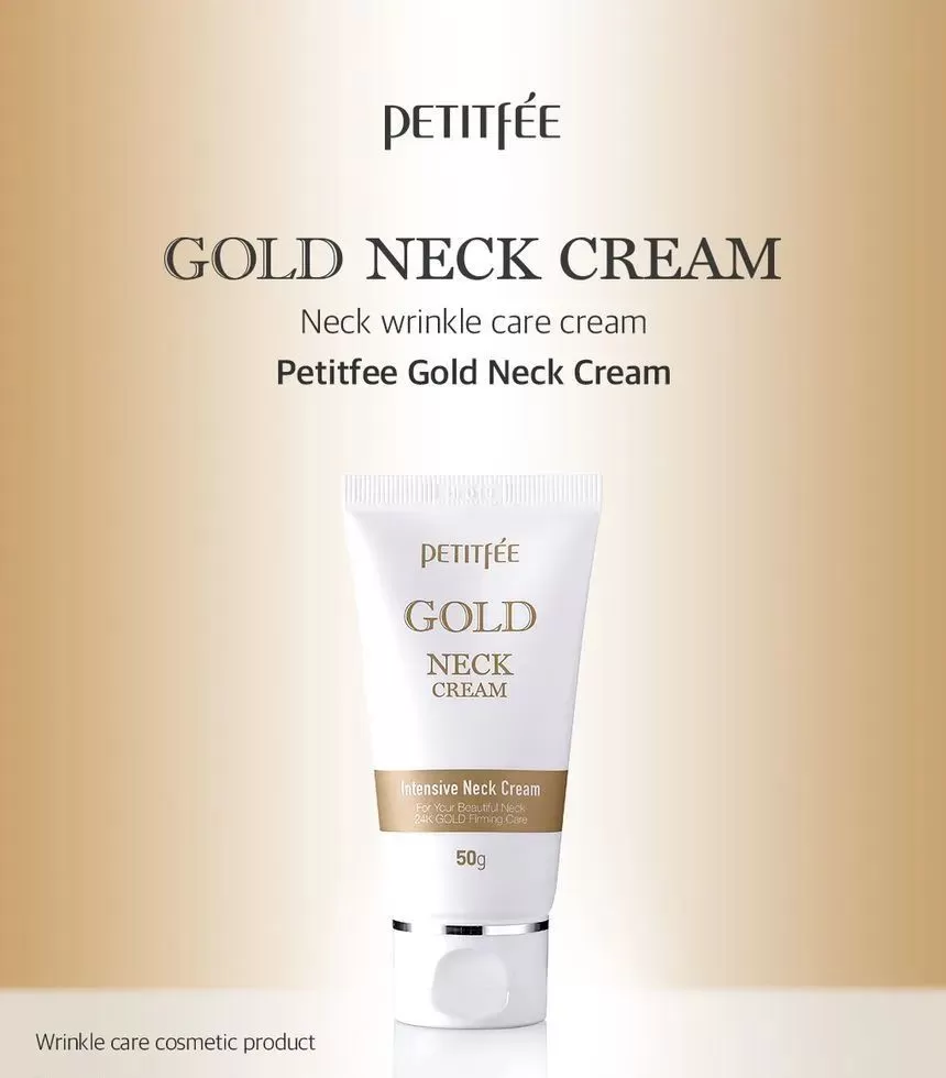 Petitfee Gold Neck Cream er en intensiv well-aging krem utviklet for å motvirke fine linjer og styrke huden rundt nakken. Denne nakke kremen vil styrke og beskytte hudbarrieren, fukte og gi næring til huden. Inneholder 24k gull og adenosin som vil forbedre hudens elastisitet, forebygge tørrhet og forsinker aldringstegn.