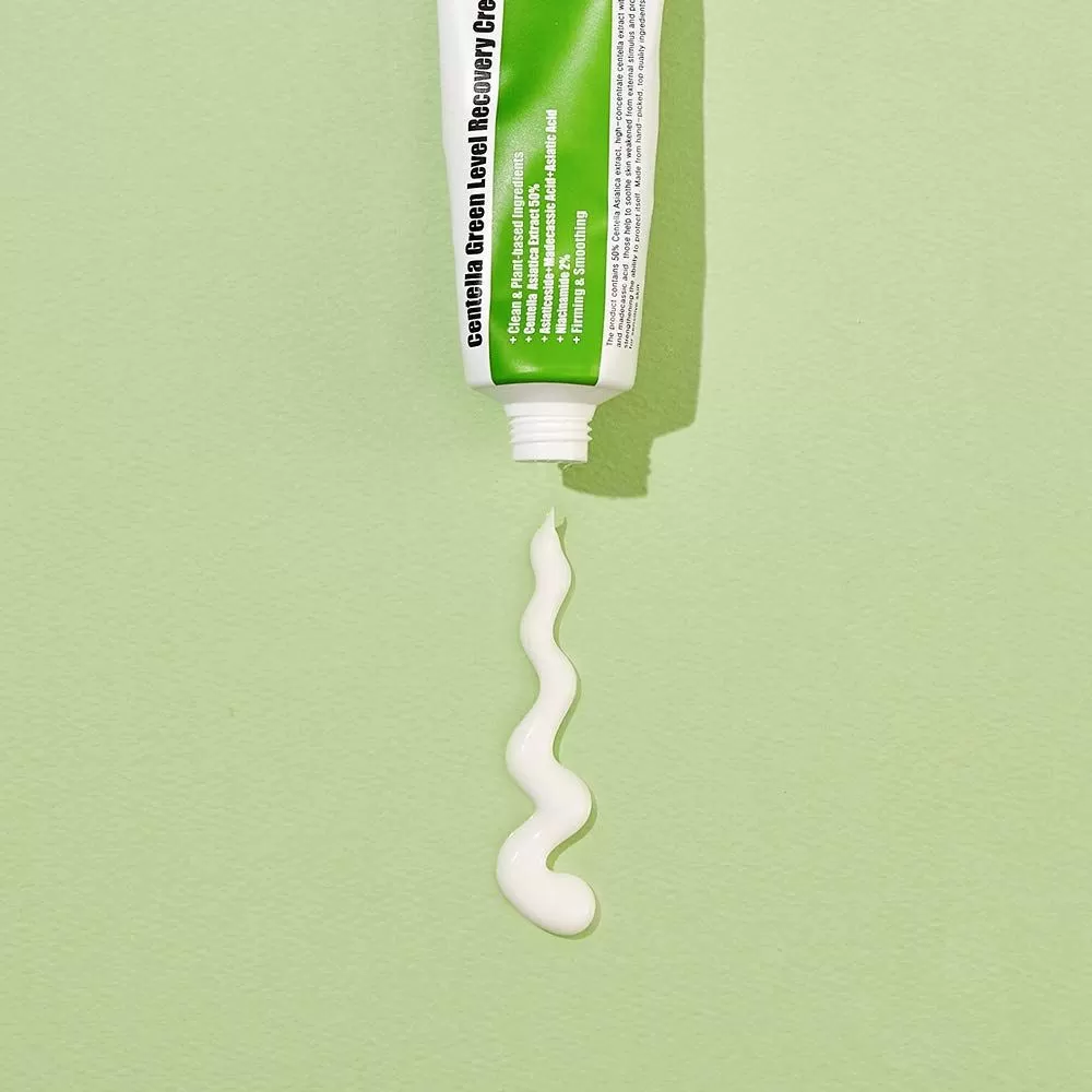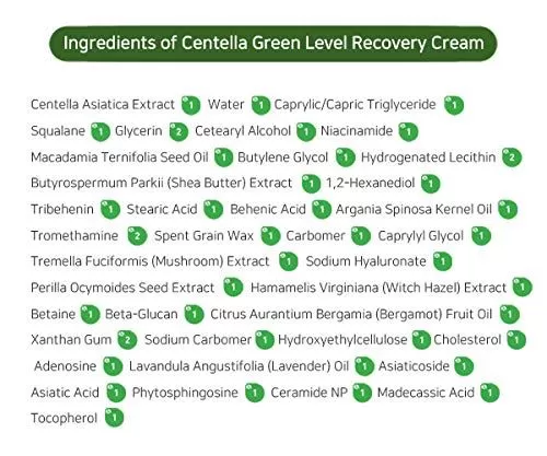 PURITO Centella Green Level Recovery Cream er en fuktighetskrem med 50% Centella Asiatica som kombinert med anti-iinflammatoriske ingredienser vil berolige sensitiv og irritert hud. Denne kremen inneholder ceramide, squalane, madecassic acid og asatic acid som vil hjelpe huden å styrke hudbarrieren slik at den holder bedre på fuktigheten. For å stimulere kollagenproduksjonen, motvirke fine linjer og pigmentflekker inneholder kremen Asiaticosidene og Adenosine.