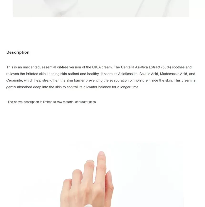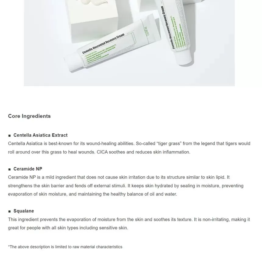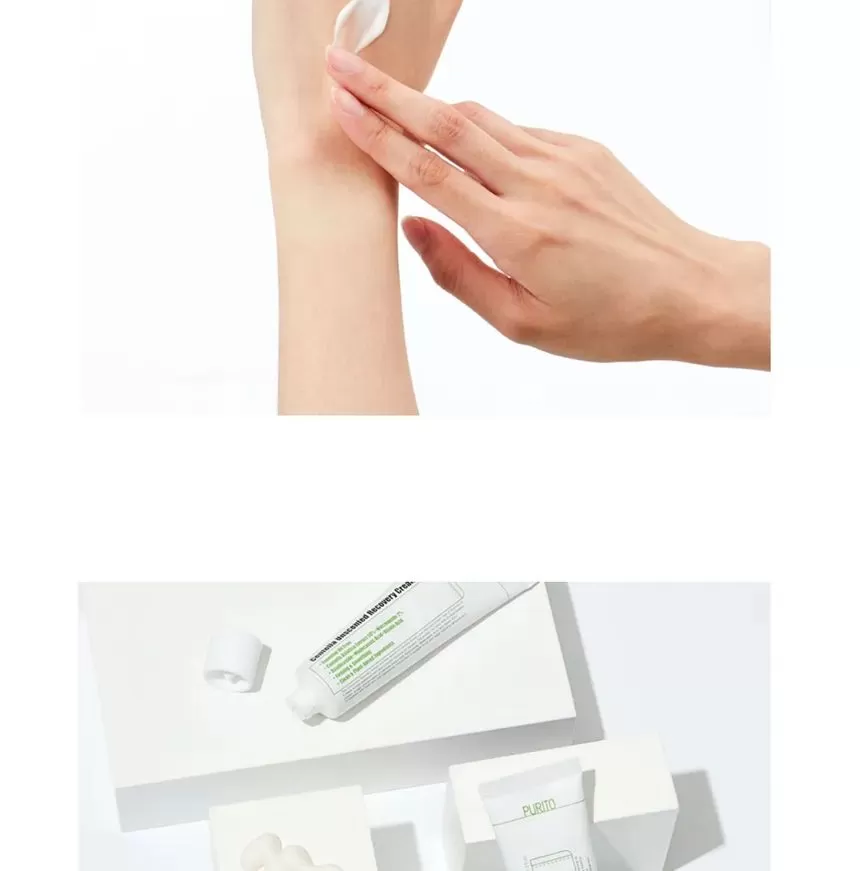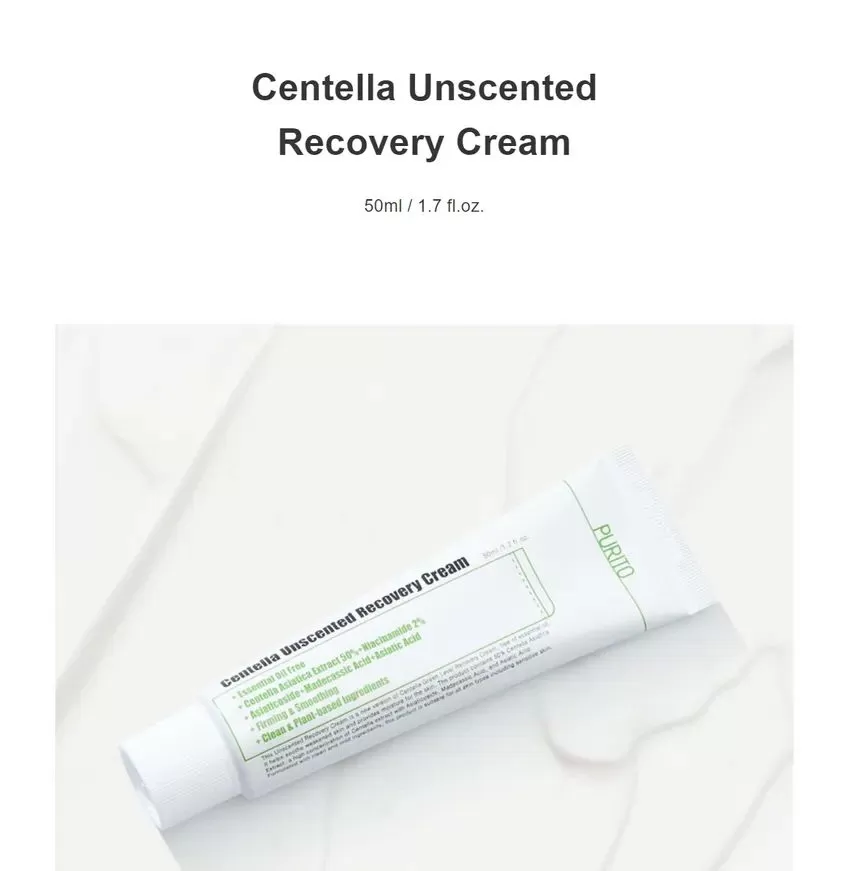 PURITO Centella Unscented Recovery Cream er en fuktighetskrem med 50% Centella Asiatica som kombinert med anti-iinflammatoriske ingredienser vil berolige sensitiv og irritert hud. Denne kremen inneholder ceramide, squalane, madecassic acid og asatic acid som vil hjelpe huden å styrke hudbarrieren slik at den holder bedre på fuktigheten. For å stimulere kollagenproduksjonen, motvirke fine linjer og pigmentflekker inneholder kremen Asiaticosidene og Adenosine.