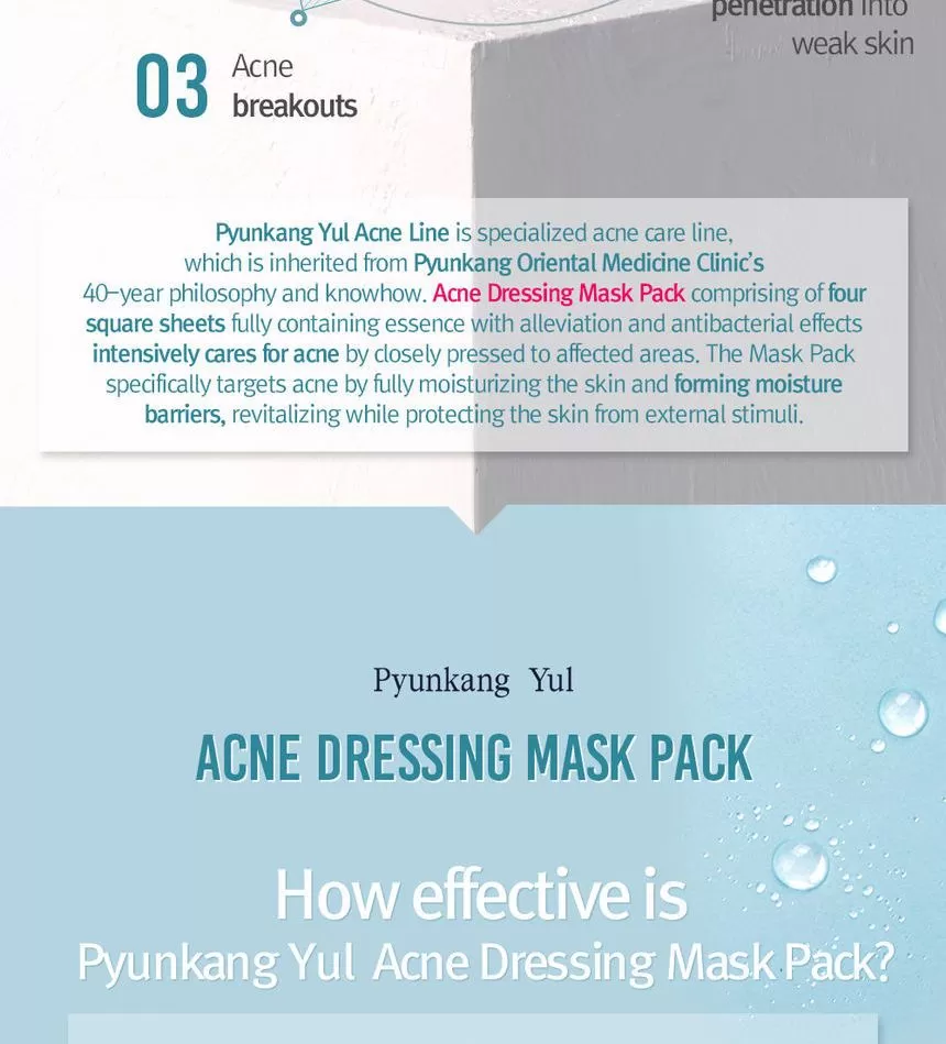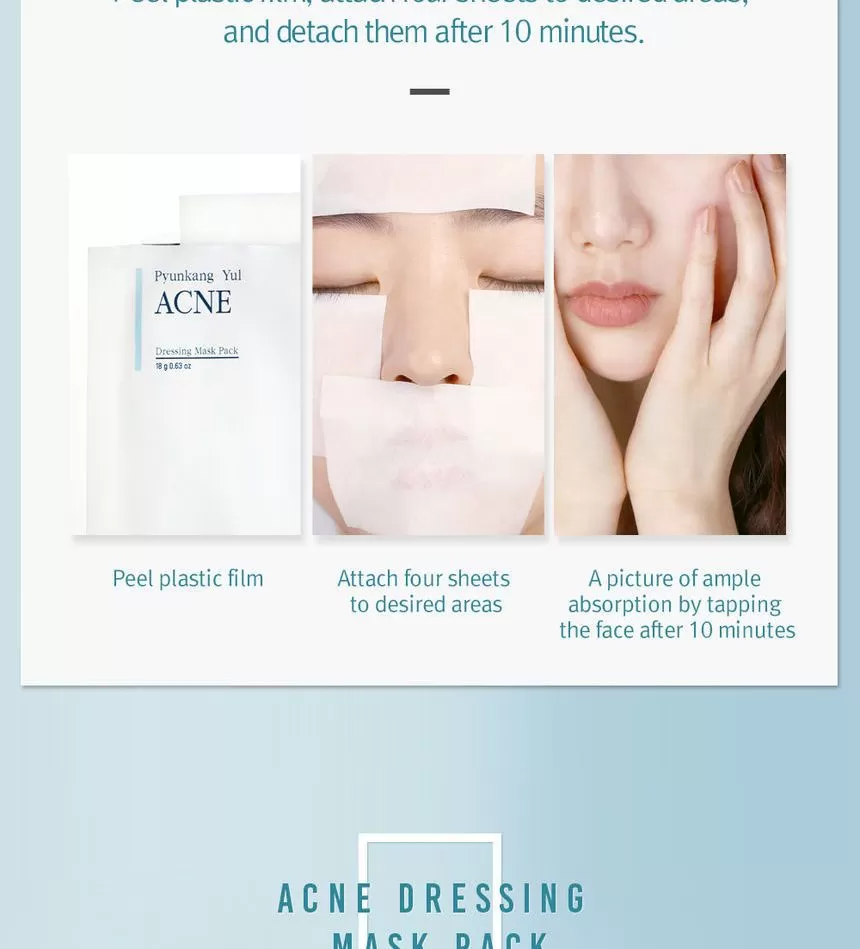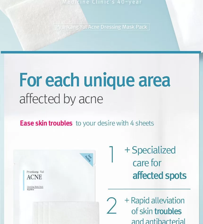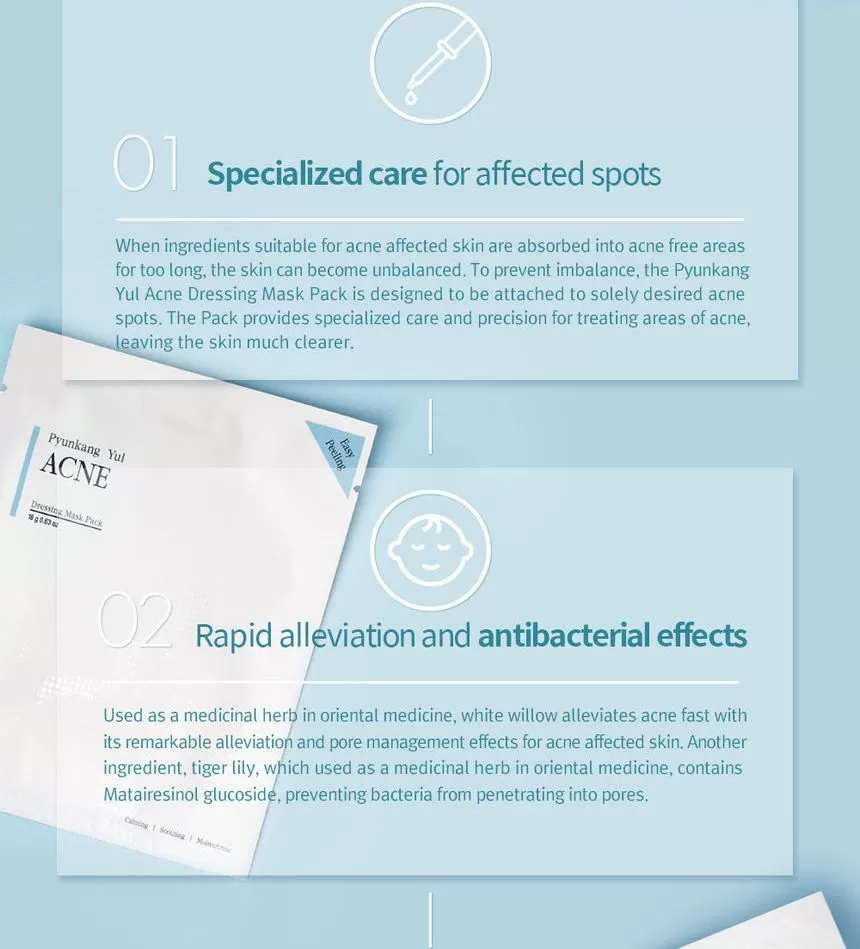 Dette er et kviseplaster utviklet av Pyunkang Yul i ACNE serien som er spesialutviklet for behandling av kviser og uren hud. Denne beskytter mot bakterier og reduserer betente kviser, plasteret plasseres over kvisen eller betente hudormer og vil redusere synligheten av kvisen/urenheten samt minske den etter behandlingen. Anbefales til bruk etter rensing av ansikt, for best effekt anbefales det å bruke denne over en natt med søvn.