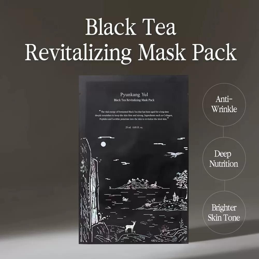 Pyunkang Yul Black Tea Revitalizing Mask er en ansiktsmaske laget for moden hud (well-aging), fylt med svart te (Kombucha) og 2 forskjellige peptider som sammen vil redusere fine linjer (rynker), gjenopprette hudens naturlige elastisitet og gi huden en naturlig glød. Lav molekyl collagen, Lecithin, Adenosine og Shea butter vil tilføre huden fuktighet og næring. Inneholder også amino syrer som vil beskytte huden mot ytre påvirkning.