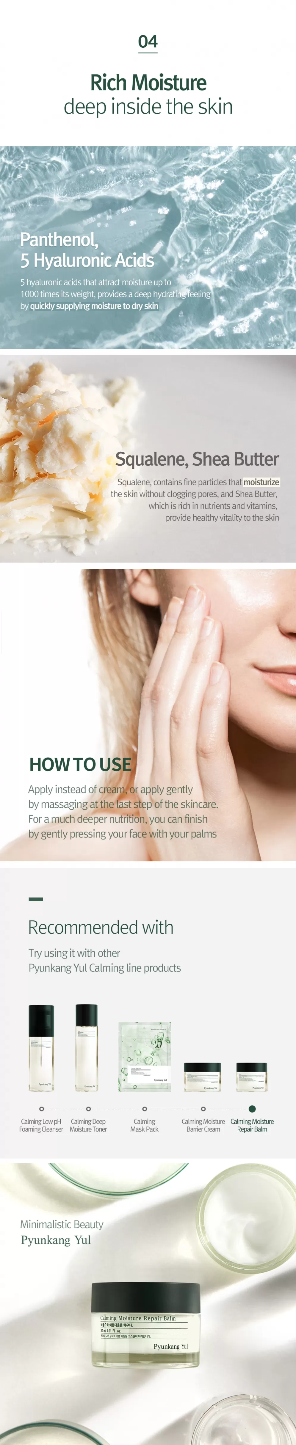 Pyunkang Yul Calming Moisture Repair Balm er en beroligende og beskyttende balm som er godt egnet for følsom hud, balmen reparerer og lindrer irritert og sensitiv hud. Denne er tilsatt Cica (Centella Asiatica), Karpifol blomsterekstrakter og Tea Tree for en beroligende effekt, den inneholder også 5 forskjellige typer hyaluronic acid for å tilføre huden mer fuktighet. Anbefales bruk i ansikt og hals, morgen og kveld.