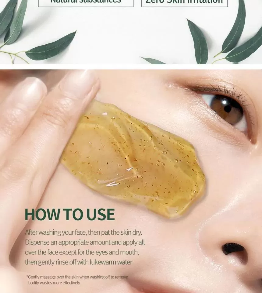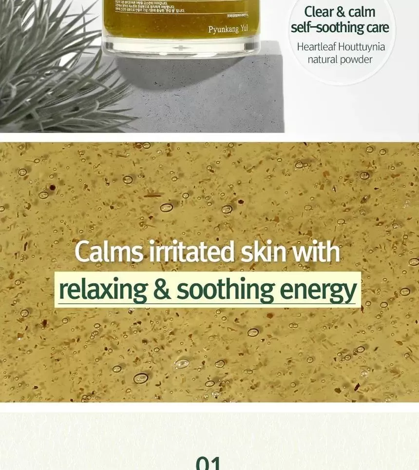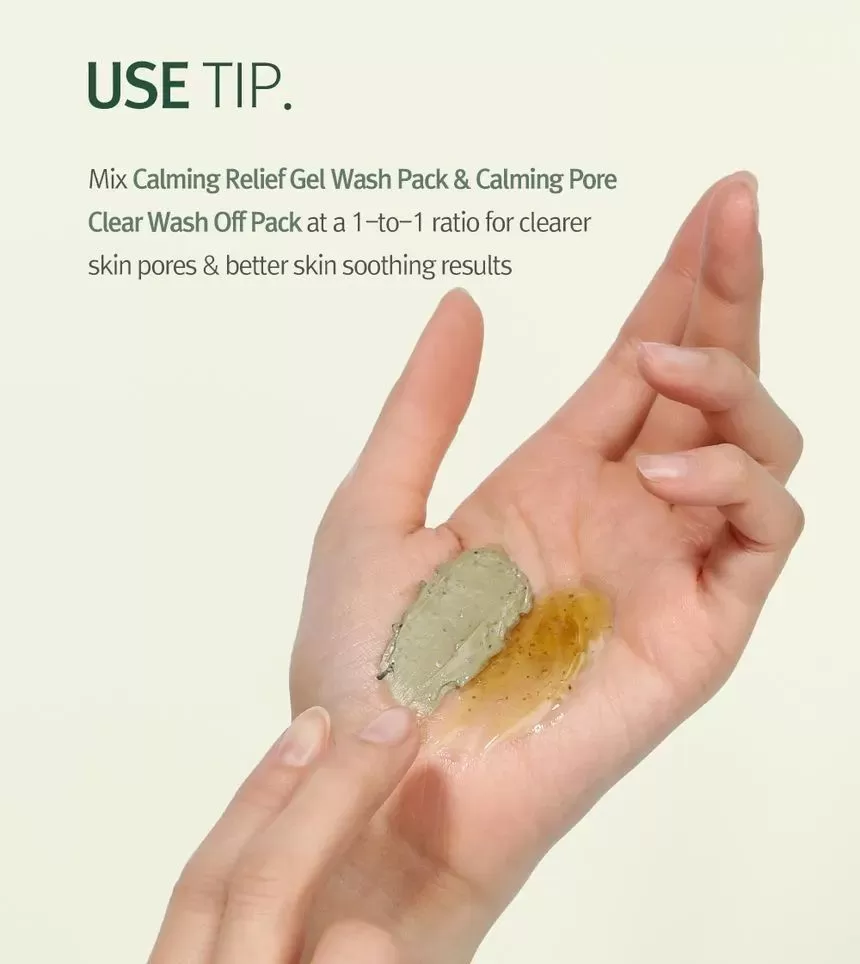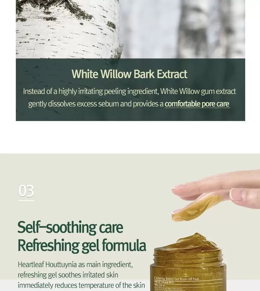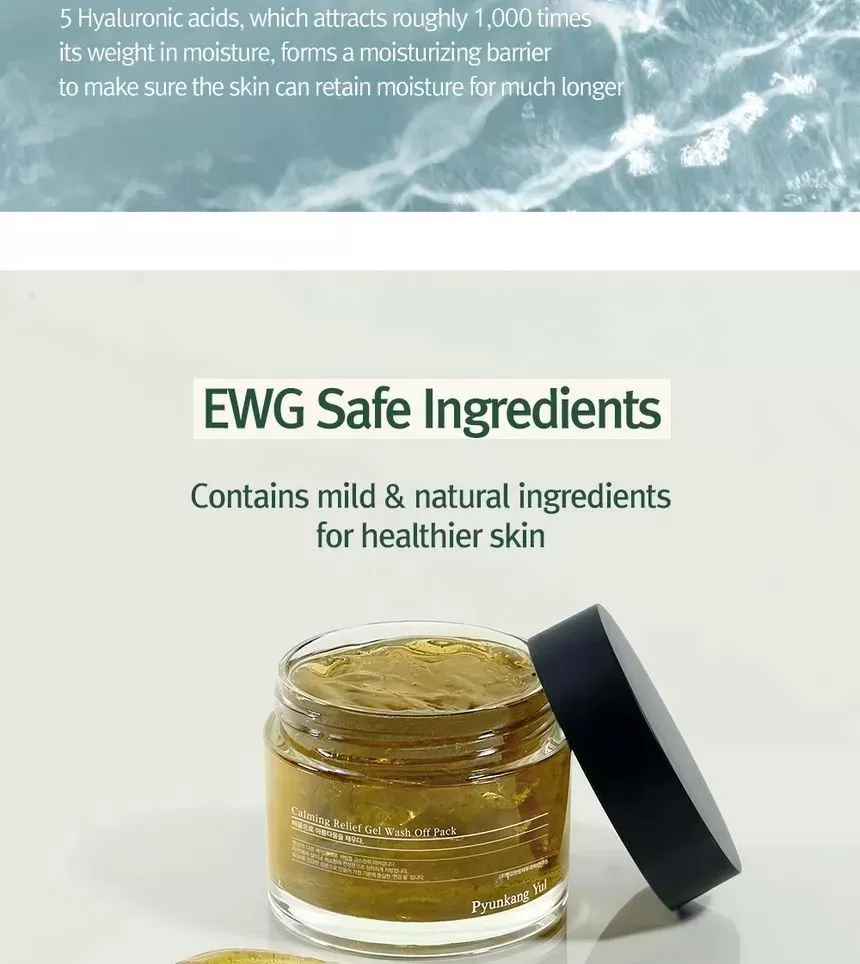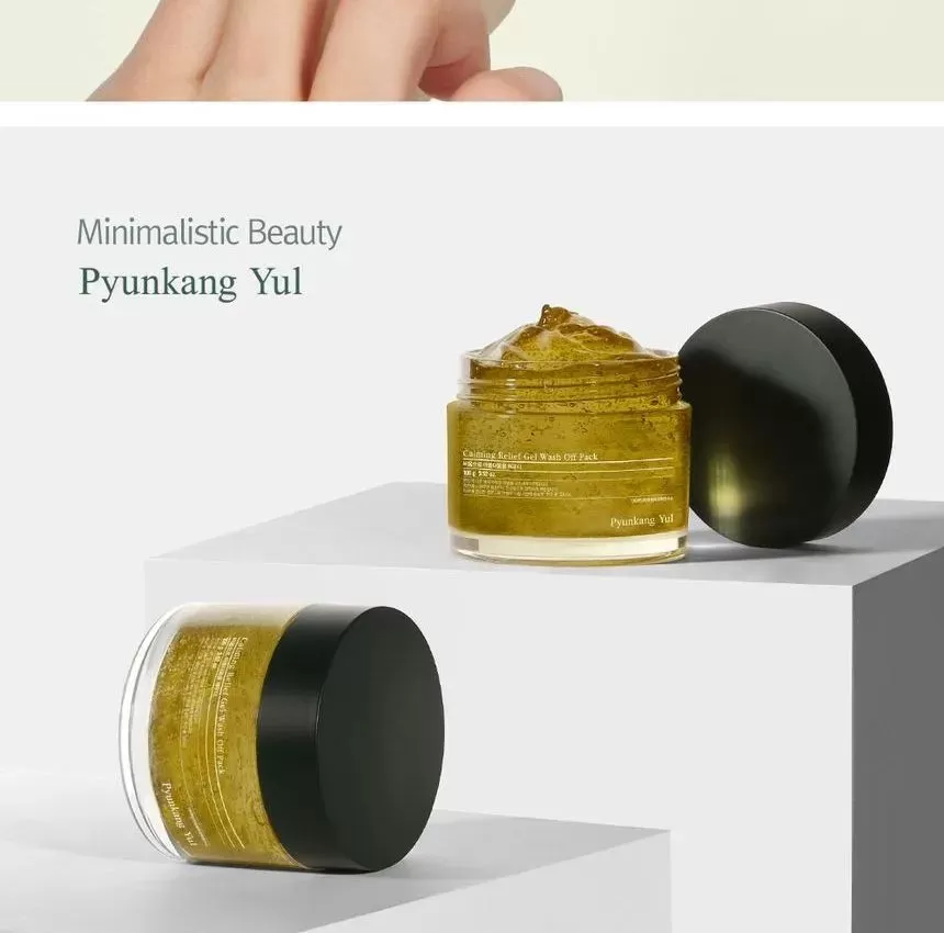Pyunkang Yul Calming Relief Gel Wash Off Pack er en wash-off maske som skånsomt eksfolierer huden for døde hudceller, berolioger og tilfører huden rikelig med fuktighet. Inneholder Centella Complex Solution som er en sammensetning av Houttuynia Cordata Extract og Tea Tree Extract som vil berolige sensitiv og irritert hud, mens bjørke-saft vil forbedre hudens tekstur, mens 5 typer hyaluronsyre vil fukte huden ned i dybden. Har en gel-aktig konsistens. Brukes etter rens, påfør ønsket mengde og masser huden mens du renser den med lunken vann. Unngå bruk i nærhet av øynene og munn.