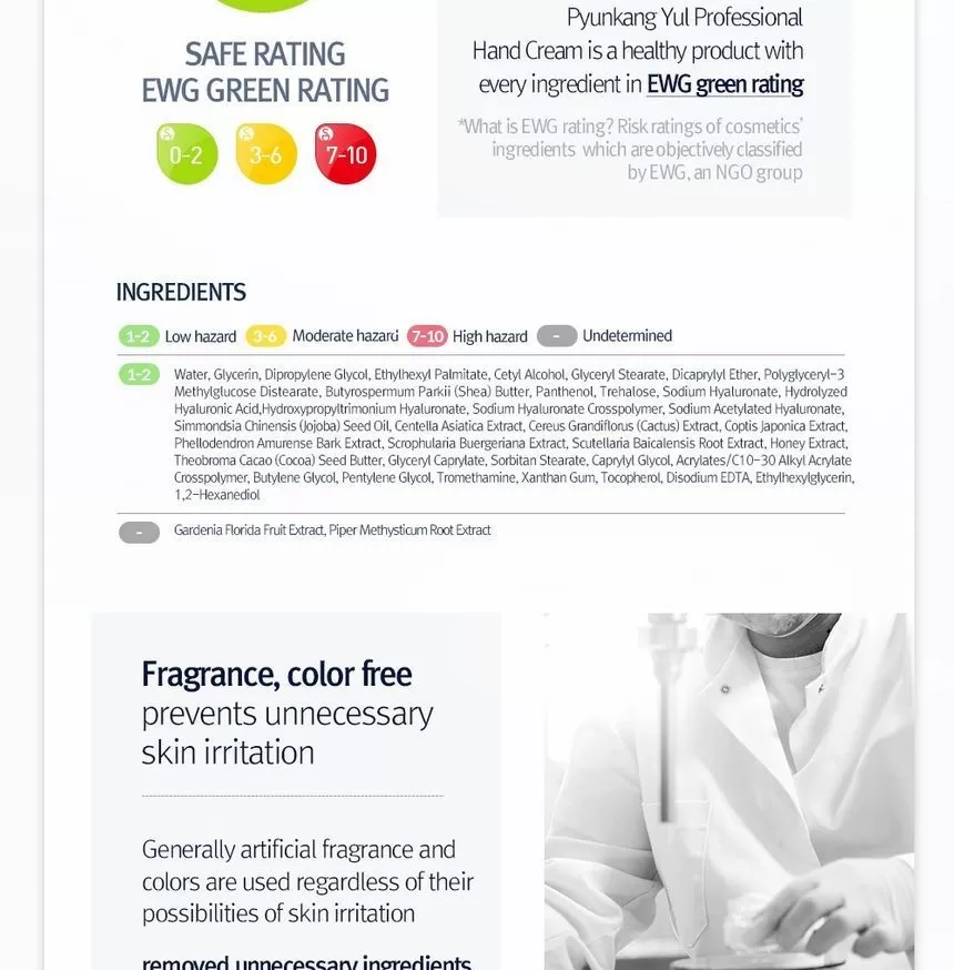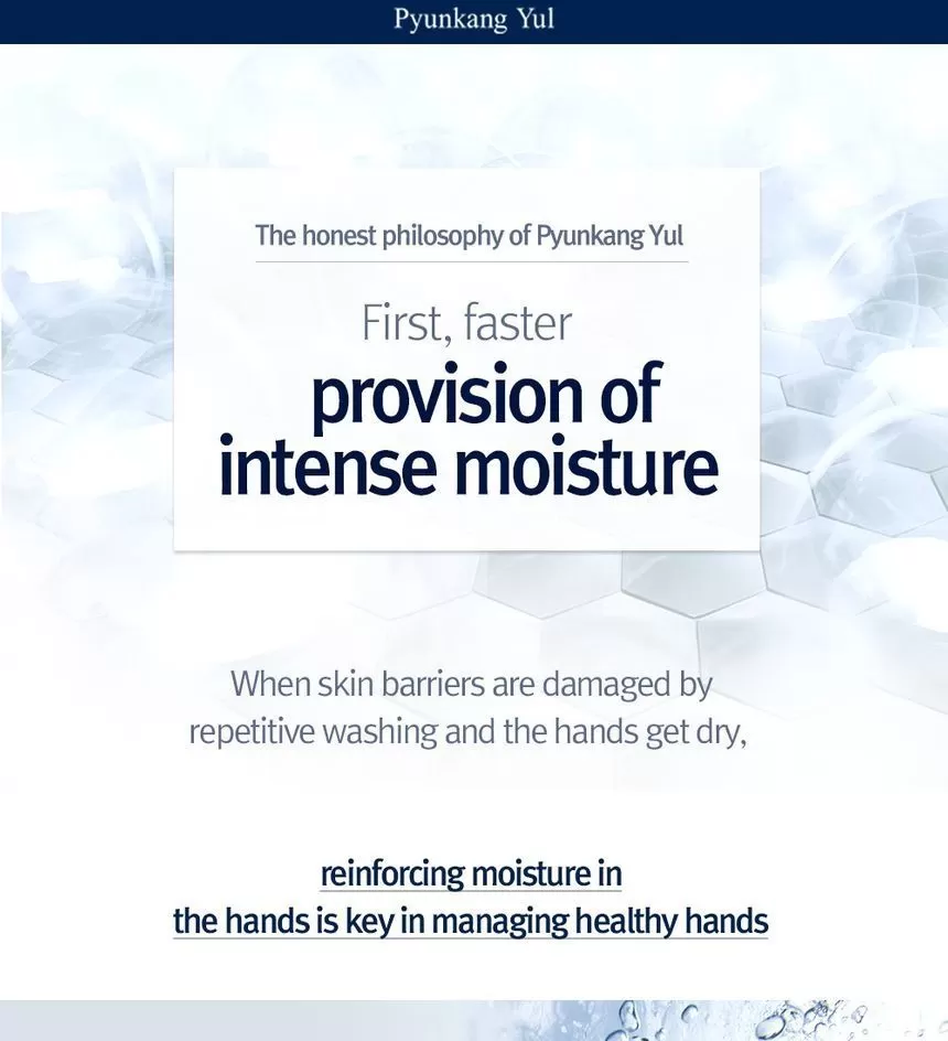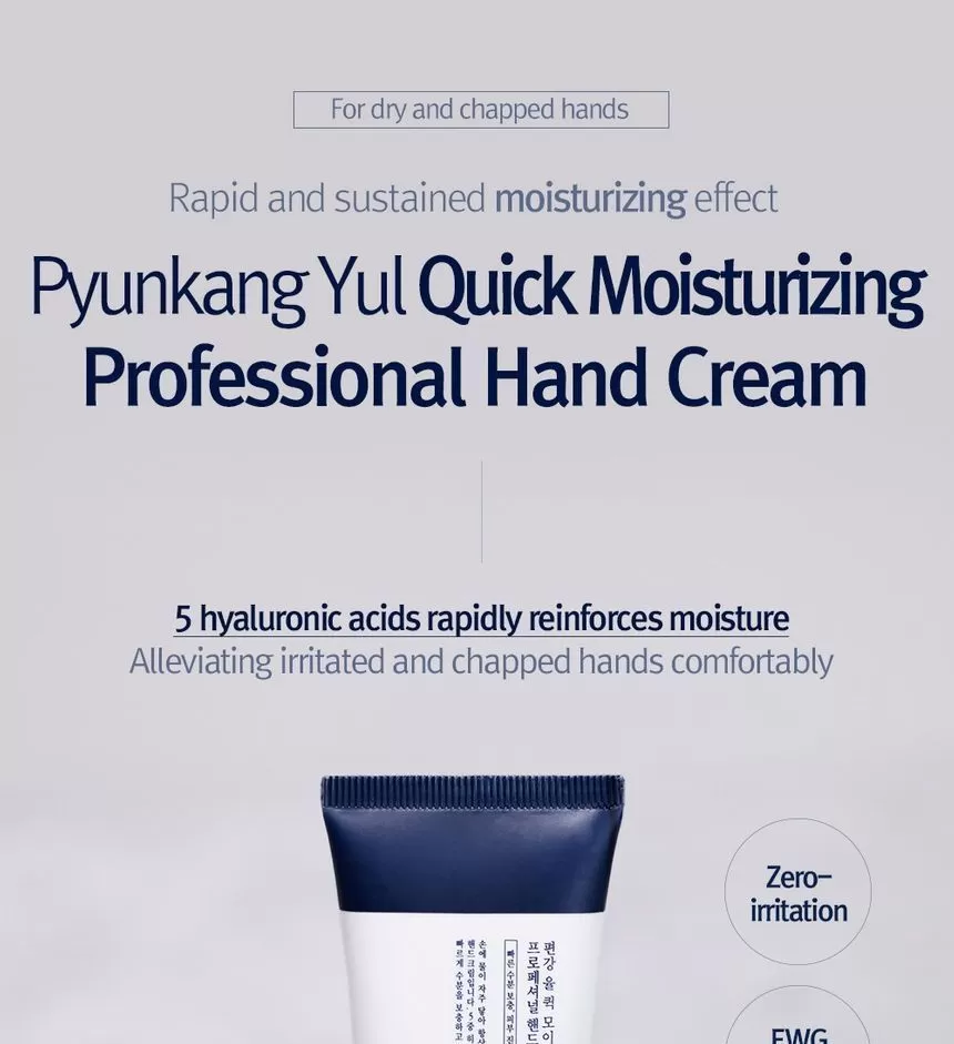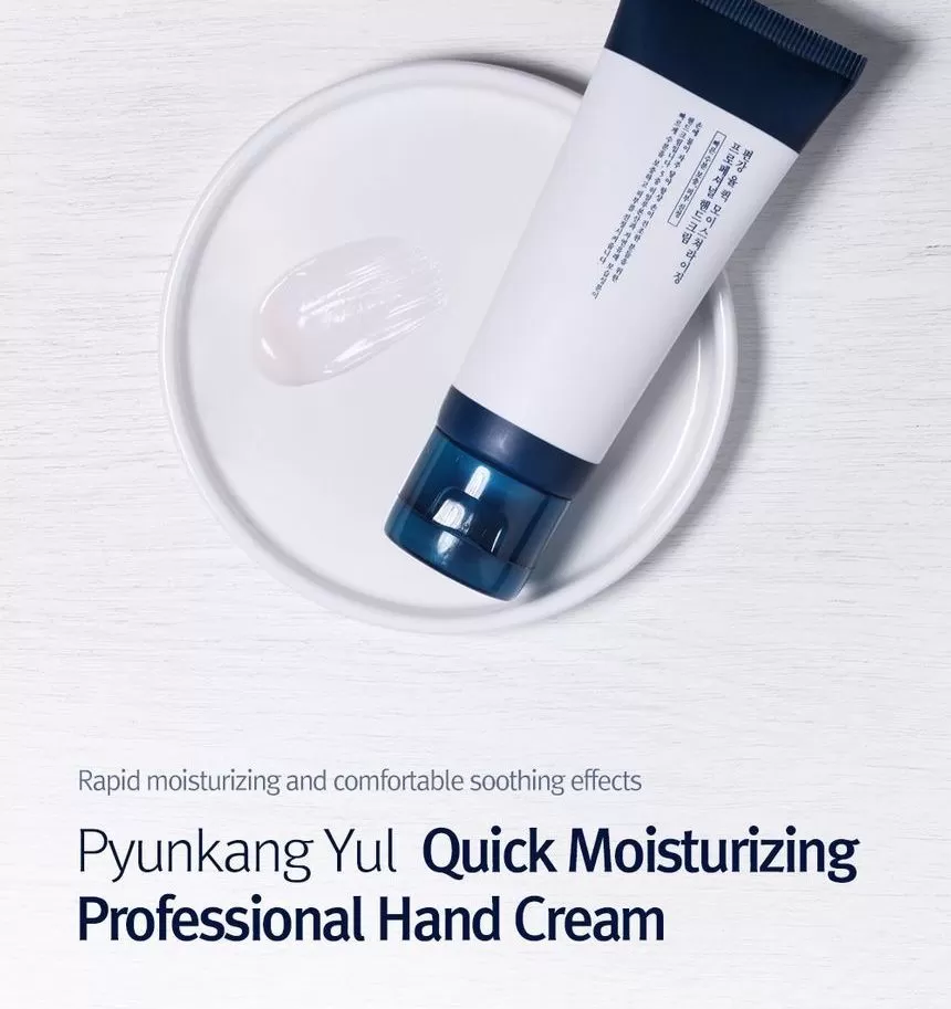 Pyunkang Yul Quick Moisturizing Professional Hand Cream er en håndkrem som absorberes av huden raskt, inneholder 5 ulike hyaluronsyrer og centella asiatica som gjør huden myk over lang tid. Inneholder ikke farge eller parfyme.