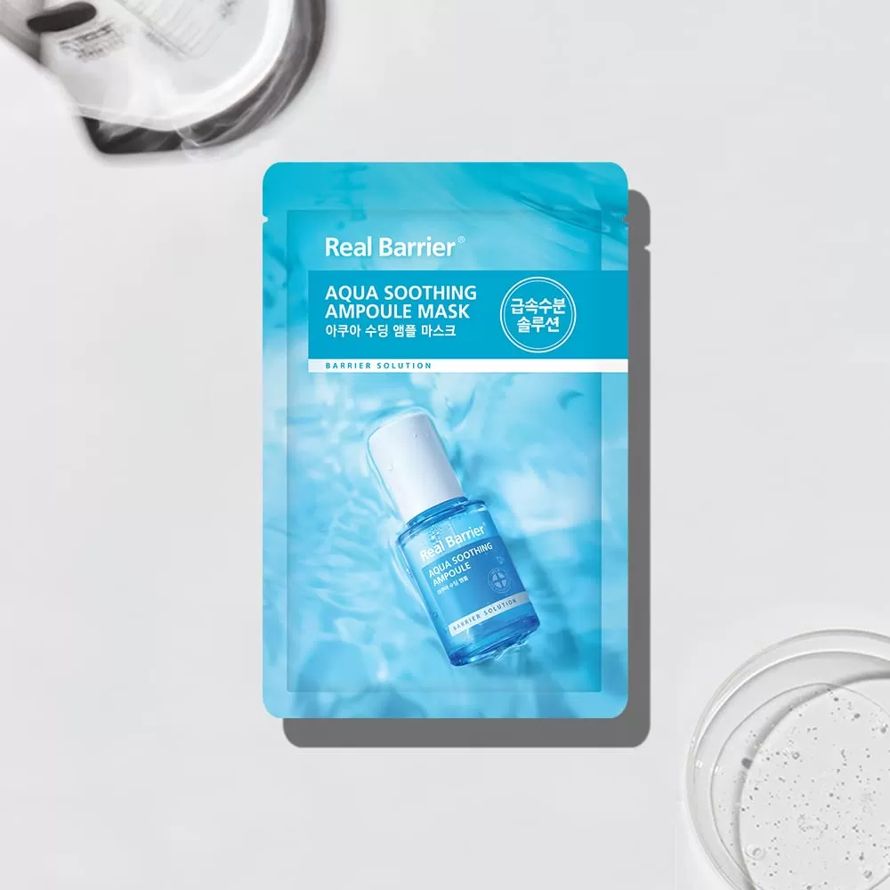 Real Barrier Aqua Soothing Ampoule Mask unik ansiktsmaske fylt med Panthenol, Allantoin for å berolige og Madecassoside for å fukte og Hyaluronsyrer som vil tilføre og binde fukt langt inn i huden. Masken er beriket med bambuskull som vil hjelpe til med å rense hud som har blitt utsatt for og skadet av miljøet. Masken inneholder også MLE hudbarriere forumlering som vil hjelpe huden å bygge opp og reparere fuktighetsbarrieren. Dermatologisk testet.