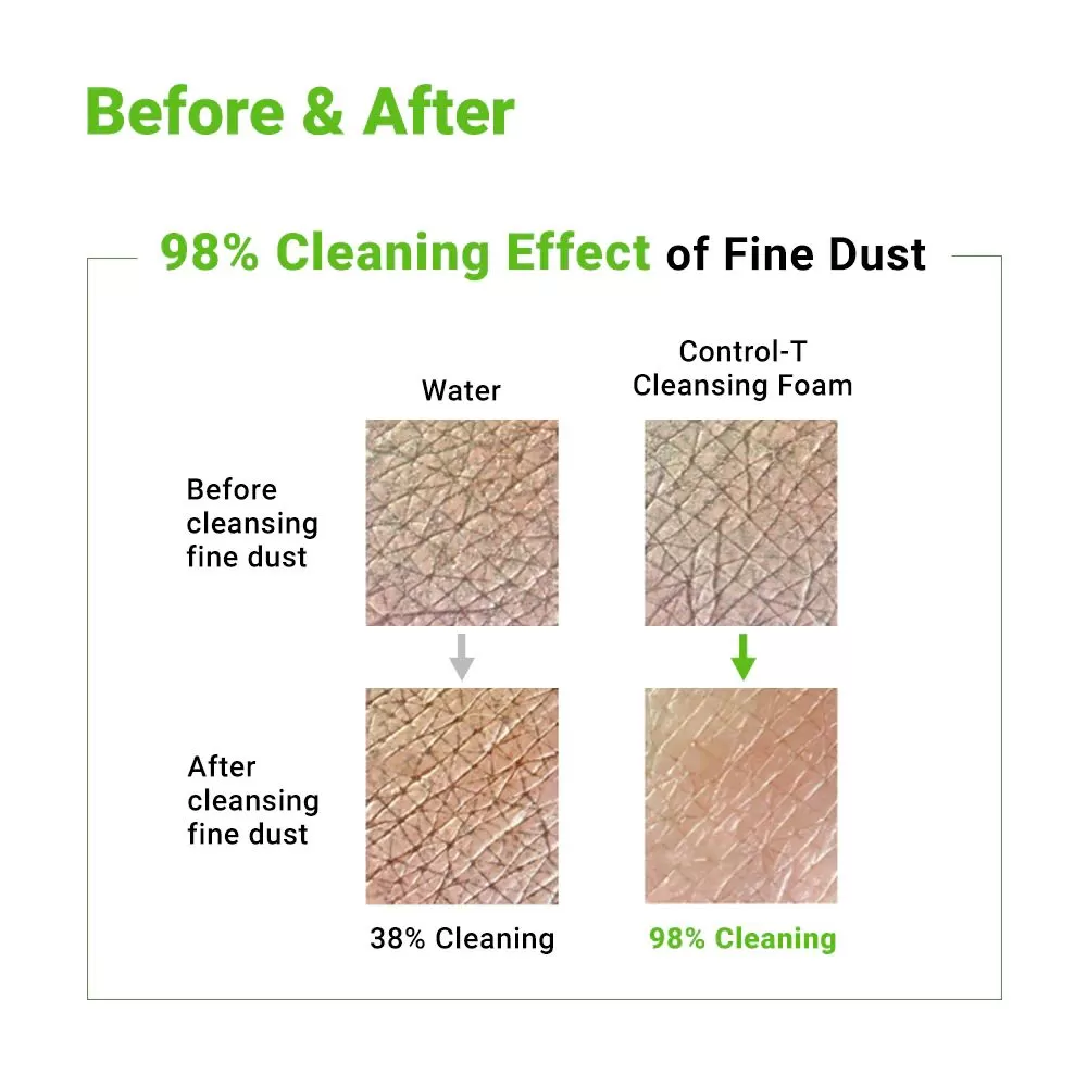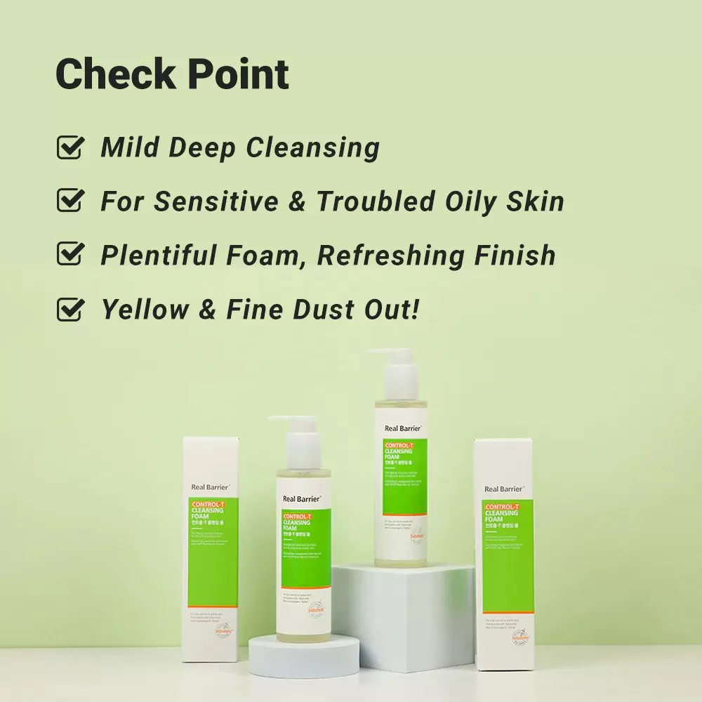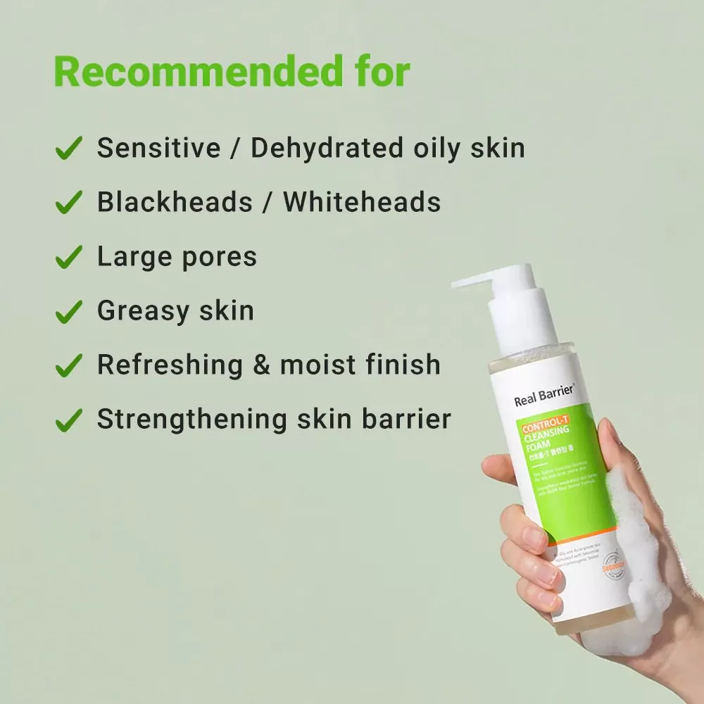Real Barrier Control-T Cleansing Foam er en skumrens utviklet for å beskytte hudbarrieren og som skånsomt fjerner sminkerester og smuss uten å tørke ut huden. Ingrediensen Sebomide™ vil rense skjult talg (sebum), forhindre kviser og utbrudd. Sebomide™ er en patentert ingrediens som er utviklet for å behandle fet og urolig hud, ingrediensen vil redusere talgproduksjonen som ofte er kjent til å forårsake kviser, samt kontrollere oljen på hudoverflaten.