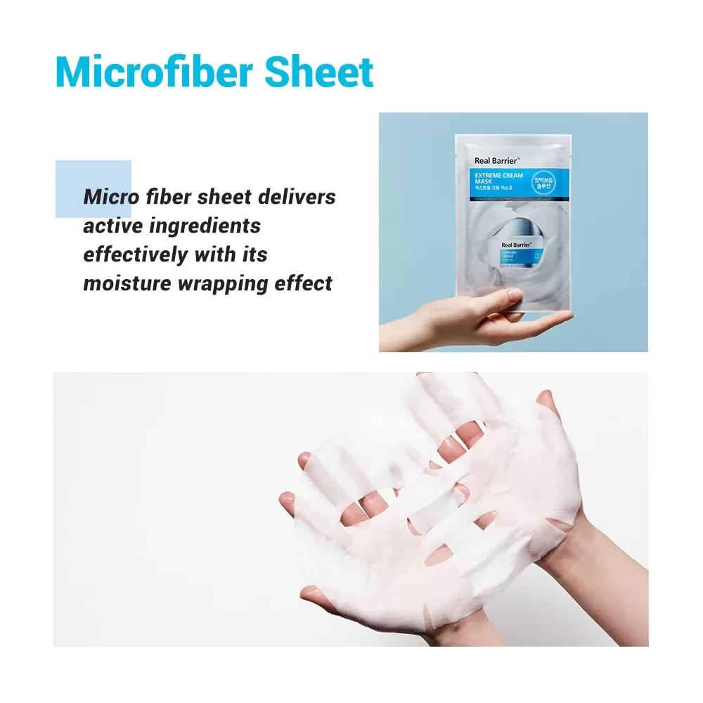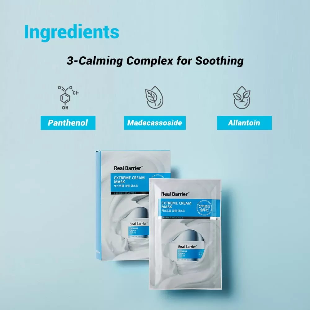 Real Barrier Extreme Cream Mask unik ansiktsmaske som gjenoppretter elastisitet og spenst til huden. Hvis du ser etter et enkelt, men effektiv hudpleieprodukt før en viktig dag, så bør du prøve denne ansiktsmasken. Inneholder 27ml Extreme Cream essens som pleier huden og hjelper huden til å se fyldig og fast ut. Peptid (Lipopeptid) vil beskytte huden din mot dannelser av linjer (well-aging) forårsaket av miljøfaktorer, som forurensning. Madecassoside vil gjøre huden din fastere. En fibermaske som dekker hele ansiktet og passer komfortabelt til alle ansiktstyper. Dermatologisk testet.