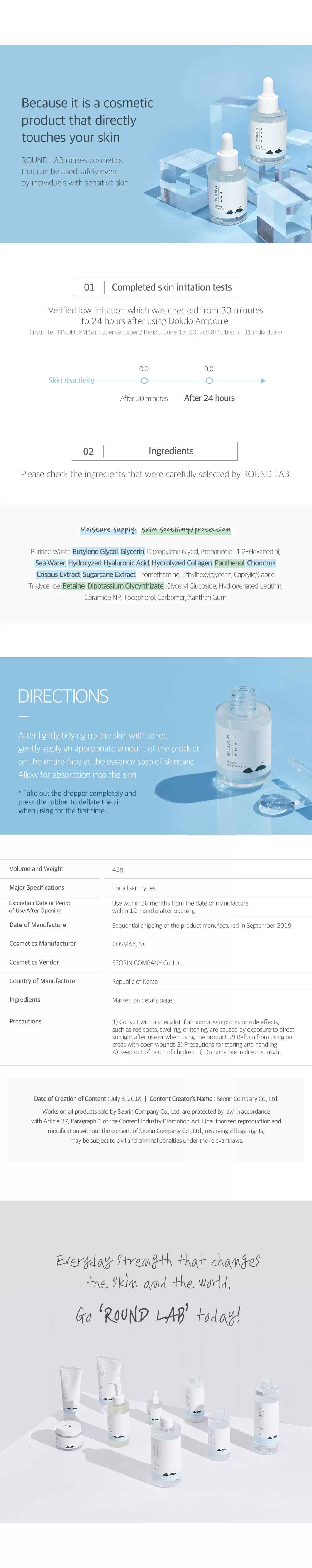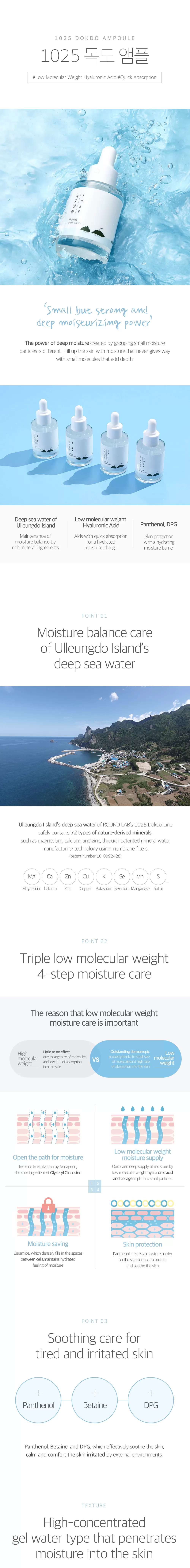 Round Lab 1025 DOKDO Ampoule er en super fuktighetsgivende ampulle som fukter huden dypt takket være lavmolekylær hyaluronsyreteknologi. En ampulle som fungerer perfekt med fuktighetsoverføring, hydrering, fuktlagring og hudbeskyttelse. Inneholder også Panthenol, Bataine og DPG som vil beskytte og berolige huden med en fuktighetsgivende membran.