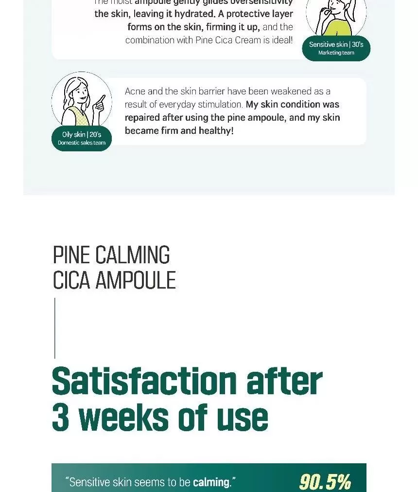 Med sin lette, raskt absorberende tekstur gir Pine Calming Cica Ampoule intens fuktighet og forbedrer hudens elastisitet uten å tette porene. LHA og PHA er inkludert for skånsom eksfoliering, som bidrar til en jevnere hudtekstur og en sunn glød. Denne ampullen er ideell for daglig bruk, spesielt for de med sensitiv eller problemhud, som trenger en balansert og beroligende løsning for en klarere hudtone. Den er også fri for skadelige kjemikalier som parabener og sulfater, noe som gjør den skånsom og trygg for sensitiv hud