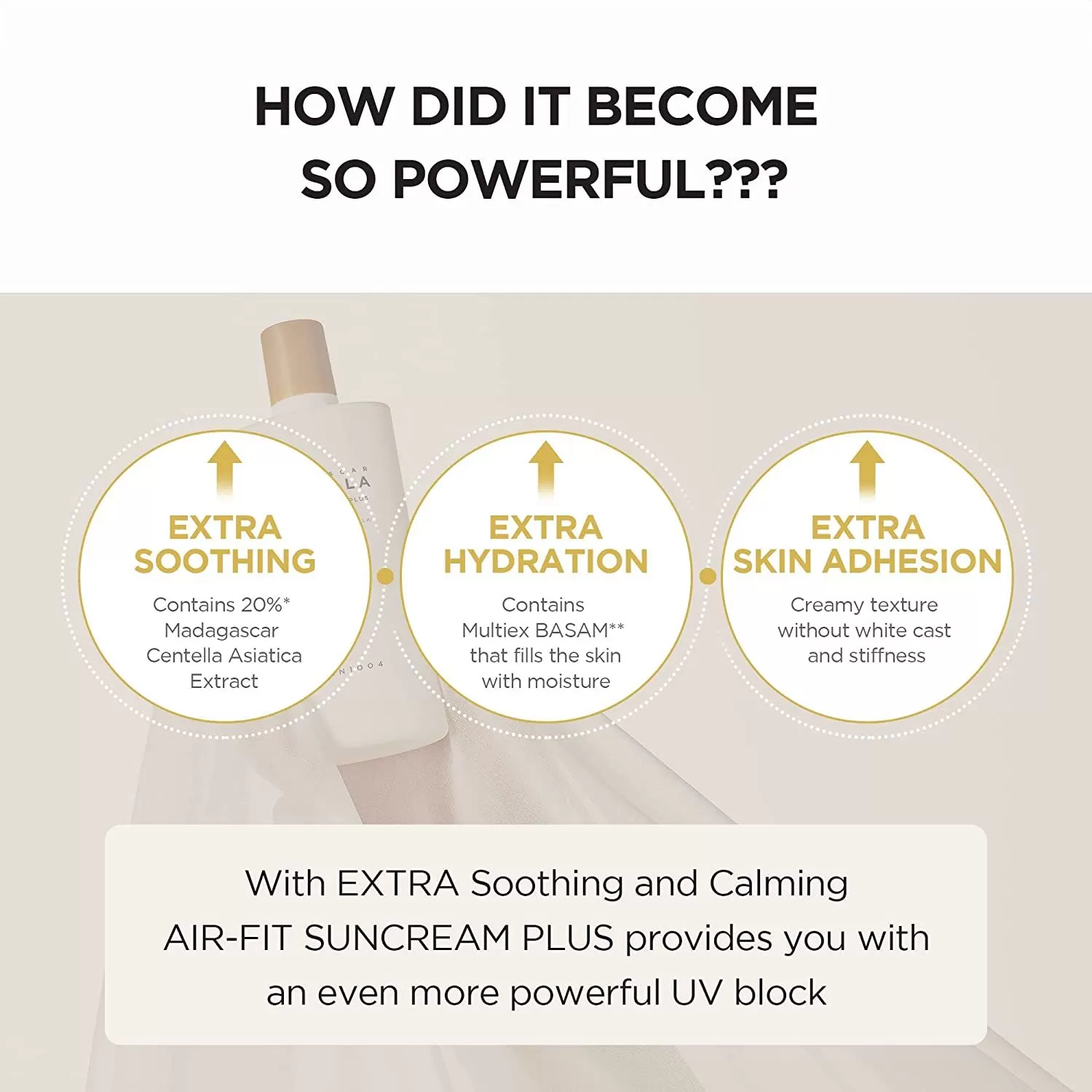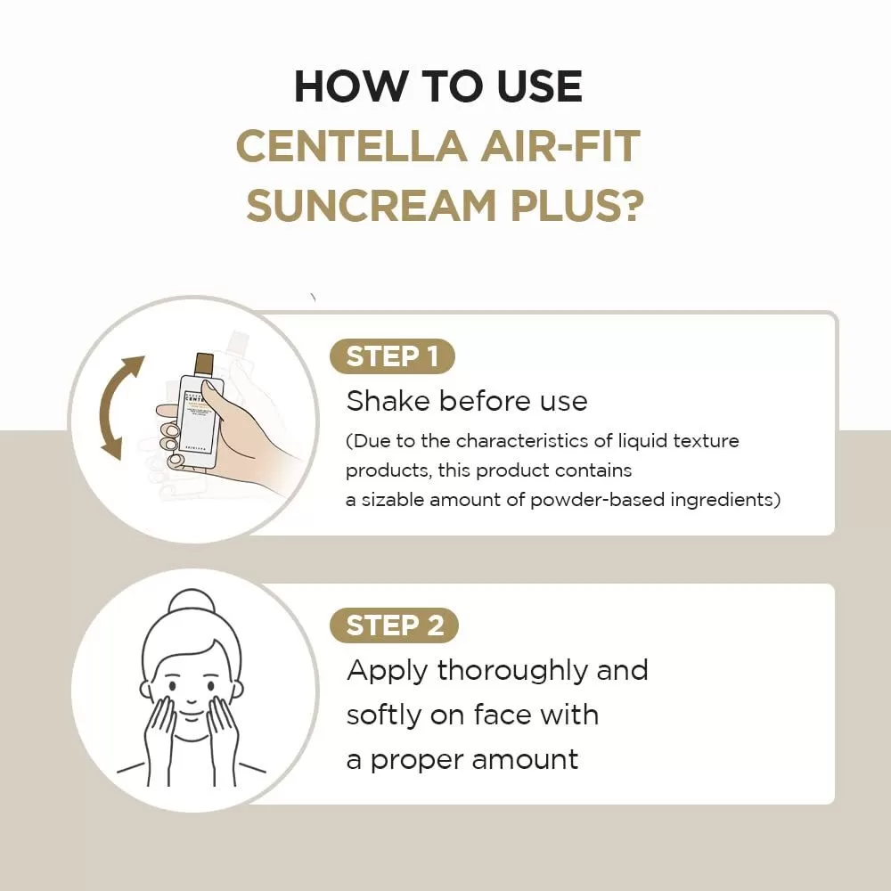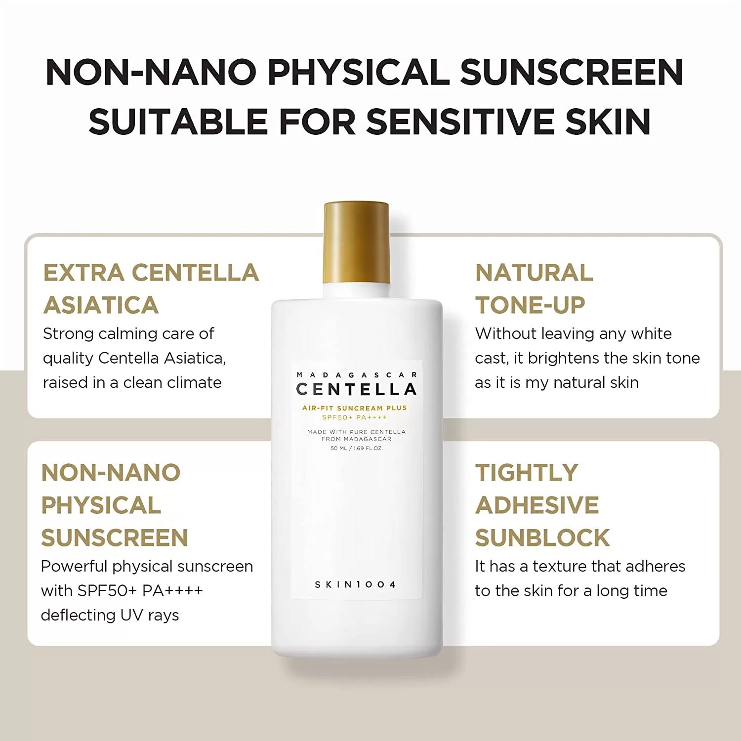 SKIN1004 Madagascar Centella Air-Fit Suncream Plus er en fysisk (mineral) solkrem med høy bredspektret UV-beskyttelse (SPF50+ PA++++), utviklet for å kombinere effektiv solbeskyttelse med hudpleieeffekt. Den inneholder høy andel ekstrakt fra Centella Asiatica (oppgitt ca. 35–36 %) som gir beroligende effekt og styrker hudens barriere. Teksturen er lett og ikke-klissete med minimal hvit skjær, og den passer godt som siste steg i morgenrutinen, også før sminke.