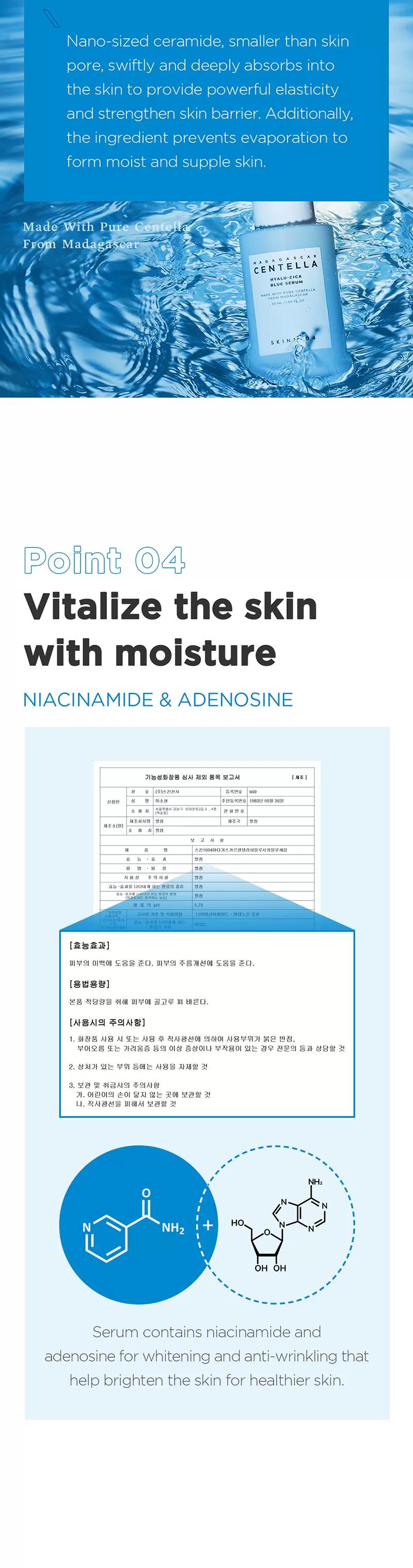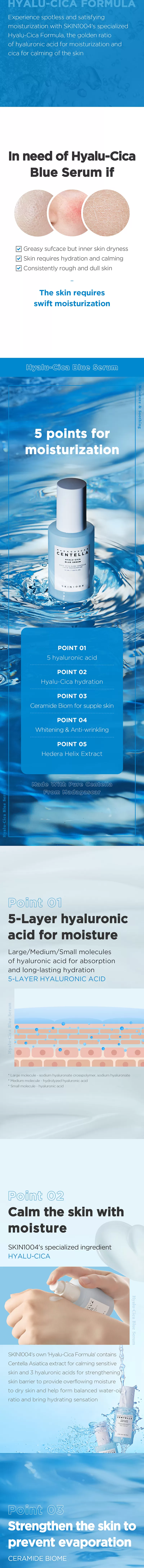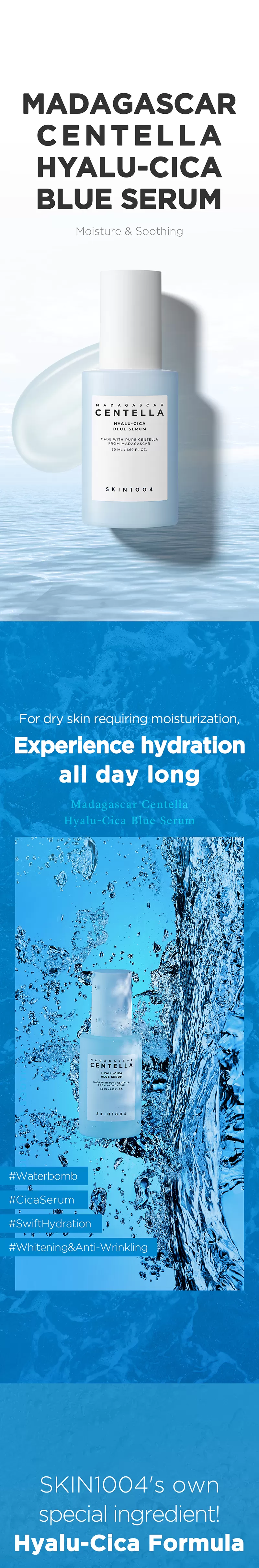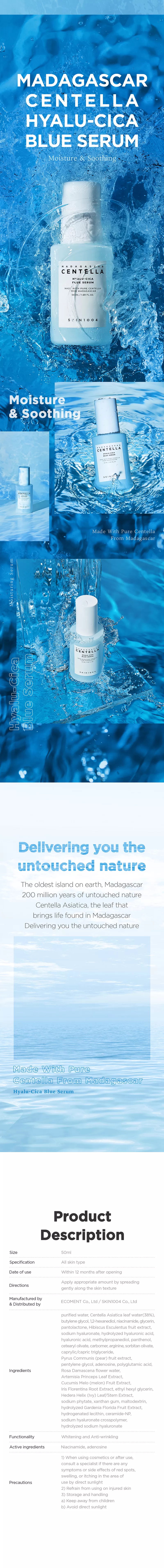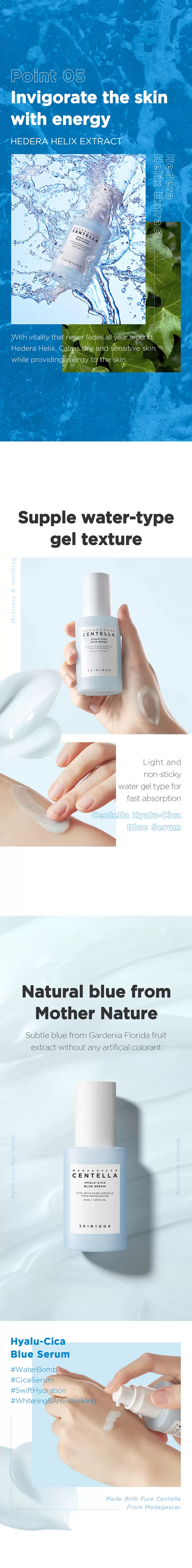 Skin1004 Madagascar Centella Hyalu-Cica Blue Serum inneholder 5-lags Hyaluronsyre for dyptrengende fuktighet og Centella Asiatica ekstrakt fra Madagaskar, kjent for å være blant den fineste i verden. Denne serumen har en beroligende effekt på tørr, sensitiv, skadet og irritert hud. I tillegg har denne serument gode ingredienser som Ceramide, Adenosin og Niacinamide som sammen bil berolige irritasjon, jevne ut hudtonen og fungere som et well-aging produkt da den også fremmer kollagenproduksjonen i huden. Sermuen har en lett konsistens som raskt vil trekke inn i huden.