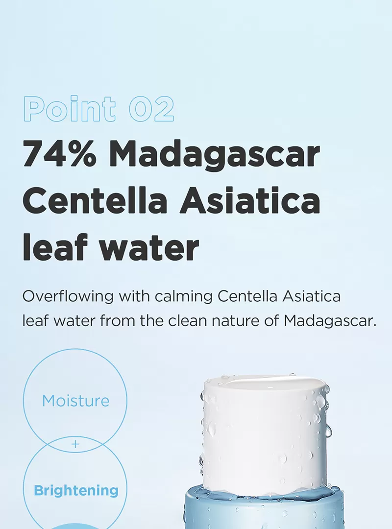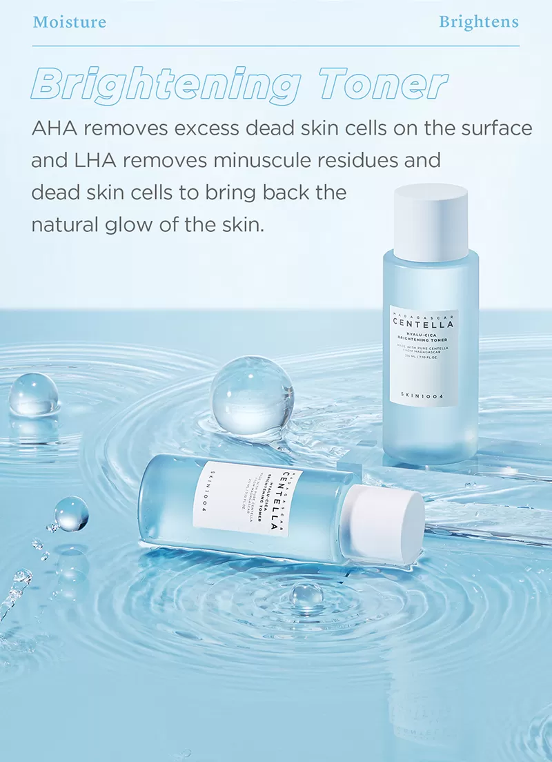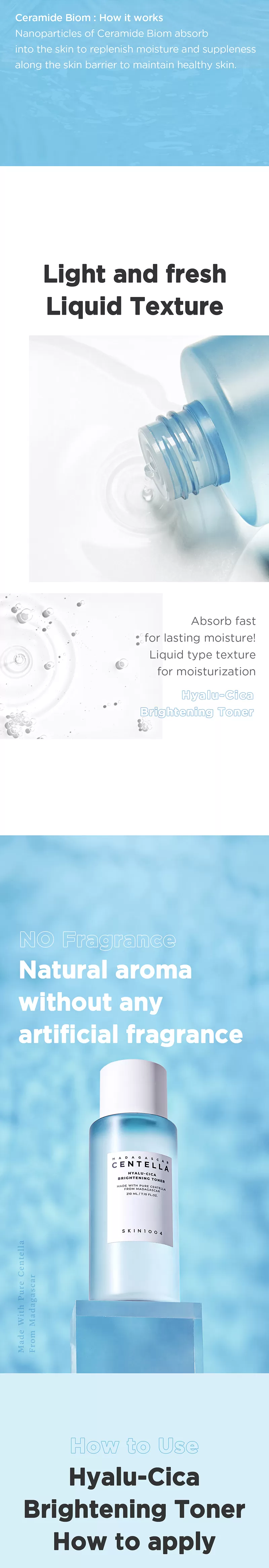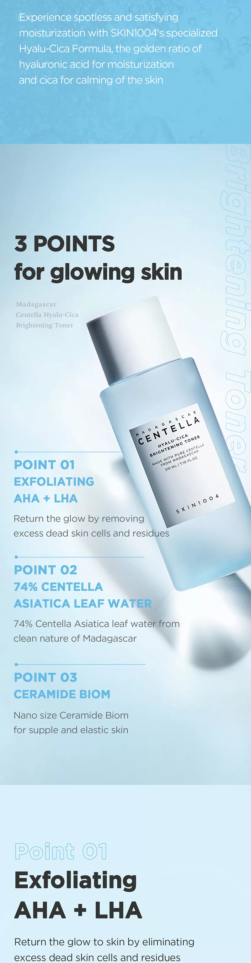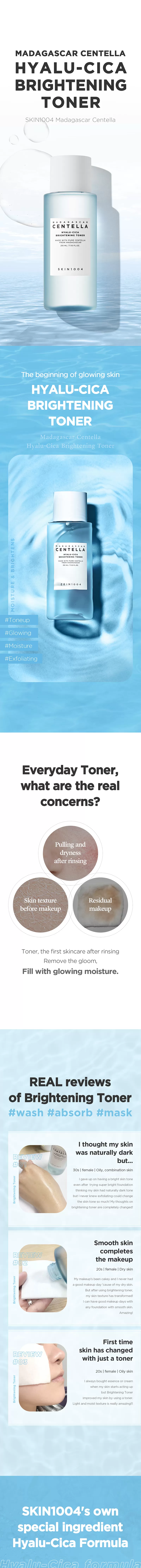 Skin1004 Madagascar Centella Hyalu-Cica Brightening Toner er en dypt og intens fuktighetsgivende toner med en lett og skånsom eksfolierende egenskap takket være AHA og LHA. Inneolder 74% Centella Asiatica bladvann Madagaskar, kjent for å være blant den fineste i verden. En duftfri toner som er utviklet for å lindre hudirritasjon samtidig som den gir huden en sunn glød.