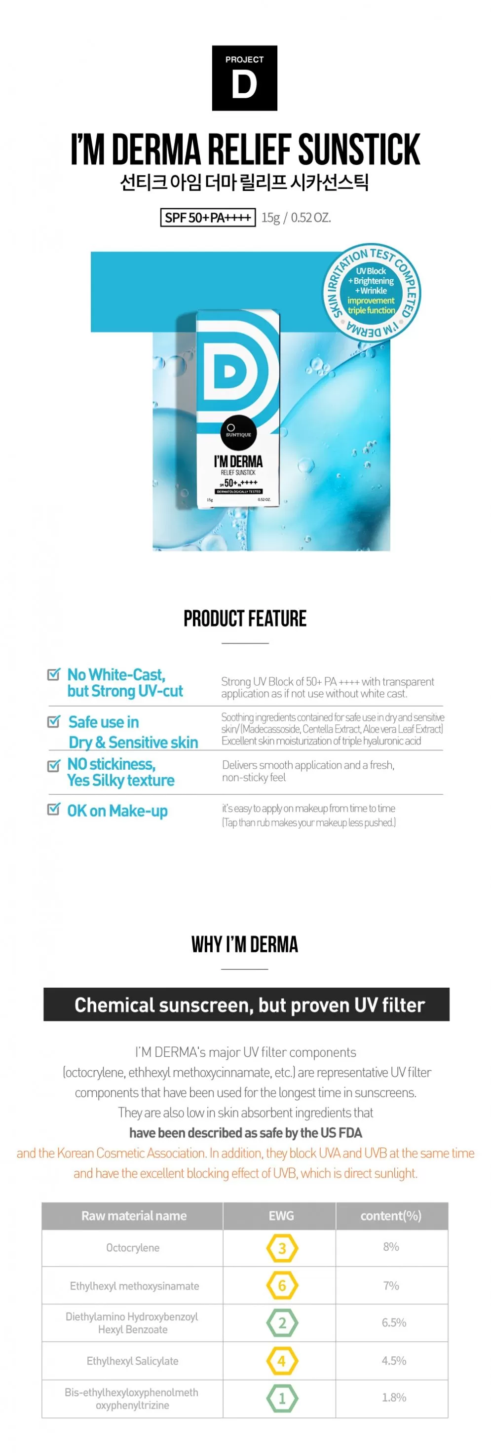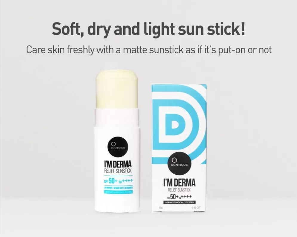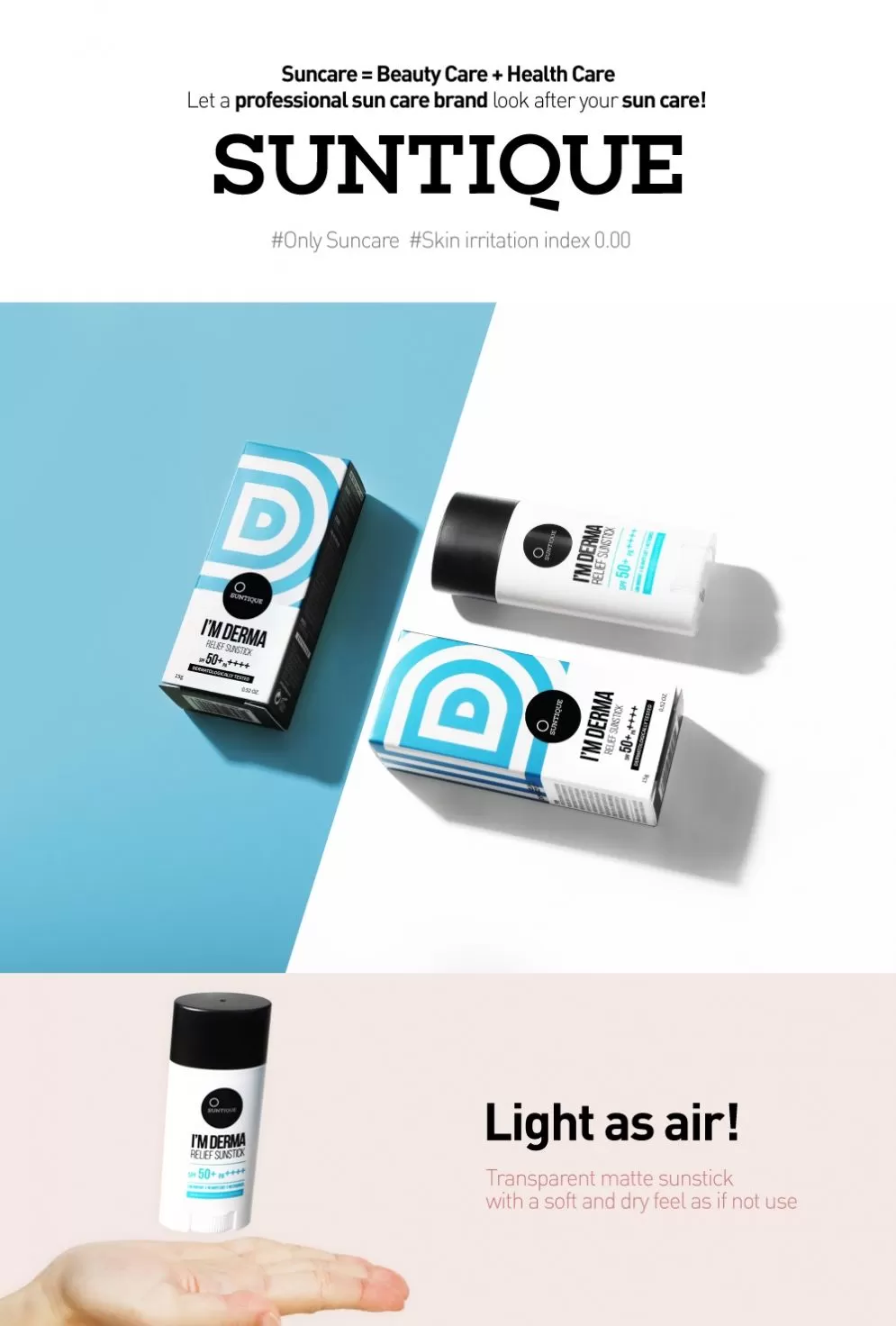 Suntique I`m Derma Relief Sunstick er en vegansk solstift med ekstrakter for ale vera og centella asiatica som lindrer og mykner opp huden. Denne solstiften inneholder 3 typer hyaluronsyrer som vil tilføre huden godt med fukt, har en herlig myk konsistens, er transparent og er meget lett å påføre. Solstiften har SPF50+ PA+++ beskyttelse som beskytter mot UVA og UVB stråling, er dermatologisk testet.