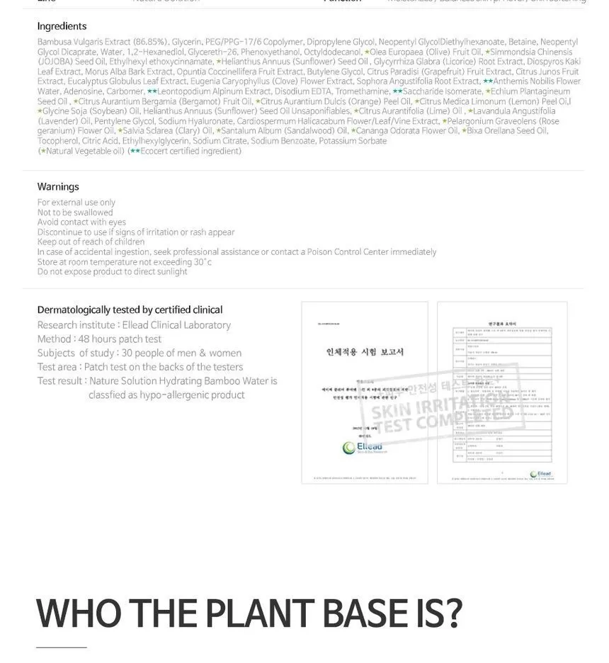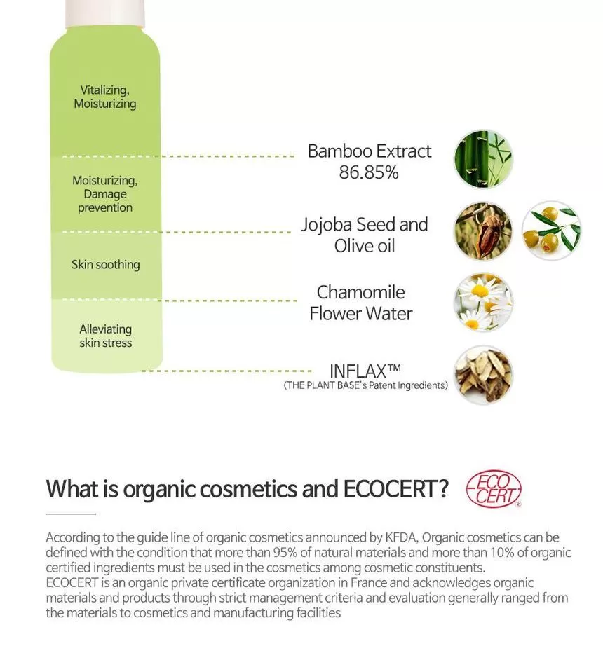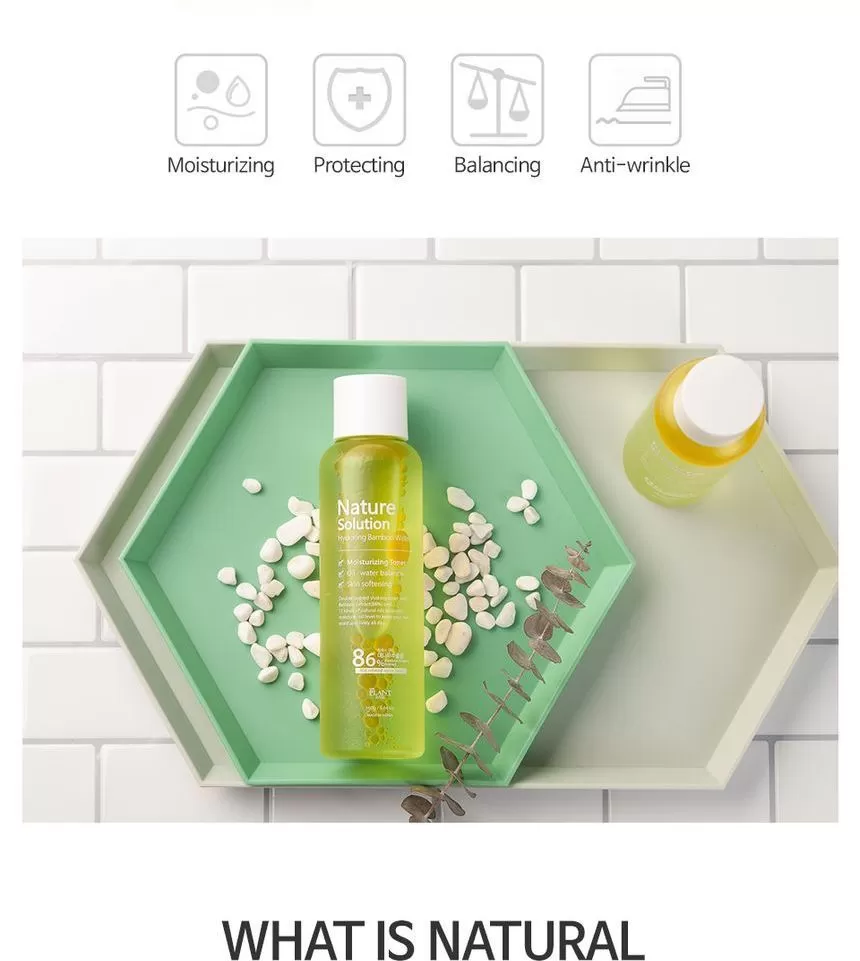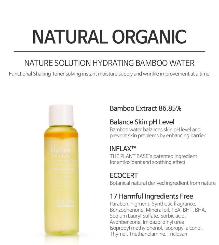 The Plant Base Nature Solution Hydrating Bamboo Water er en toner som inneholder 86.85% bambusekstrakt som sammen med botaniske oljer (Inflax™) beroliger og balanserer huden. Toneren hjelper mot fine linjer ved hjelp av Adenosine, gir buden både næring og rikelig med fuktighet. Denne vil hjelpe huden å balansere pH-verdien og styrker hudbarrieren.