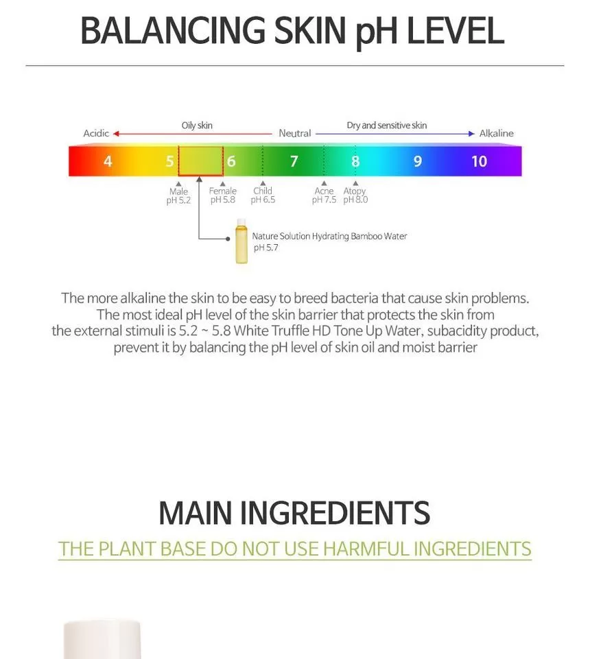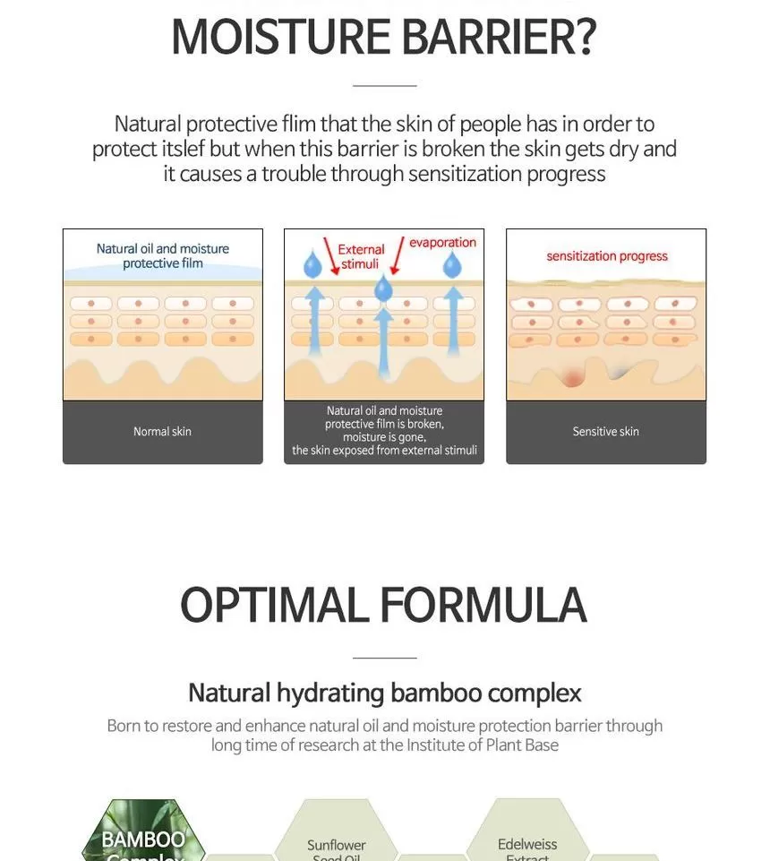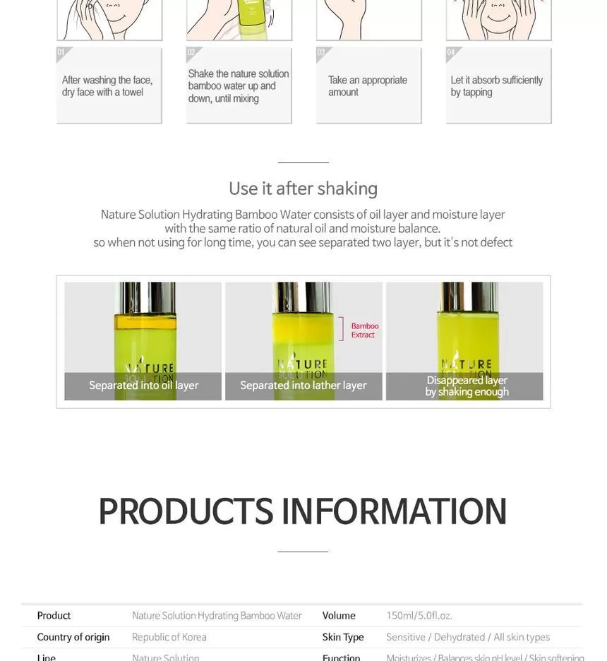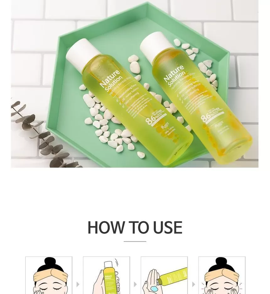 The Plant Base Nature Solution Hydrating Bamboo Water er en toner som inneholder 86.85% bambusekstrakt som sammen med botaniske oljer (Inflax™) beroliger og balanserer huden. Toneren hjelper mot fine linjer ved hjelp av Adenosine, gir buden både næring og rikelig med fuktighet. Denne vil hjelpe huden å balansere pH-verdien og styrker hudbarrieren.