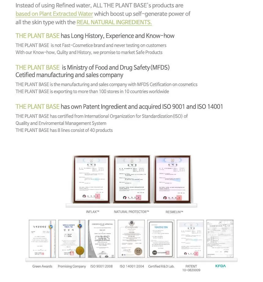 Etablert i 2005, The Plant Base ble raskt populær med sine 100% naturlige håndlagde såper. Med et ønske om å lage naturlig hudpleie og kosmetikkprodukter egnet for familiebruk, dyrker varemerket kontinuerlig hypoallergene og høykvalitetsprodukter, The Plant Base er i dag en av de ledende kosmetikk og hudpleiemerkene i Korea. Alle produkter er 100% laget i Korea og er Cruelty-Free.