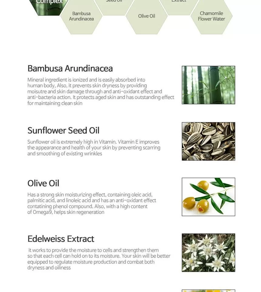 Toneren inneholder også Jojobafrø olje, olivenolje, edelweiss ekstrakt og kamilleblomst ekstrakt.