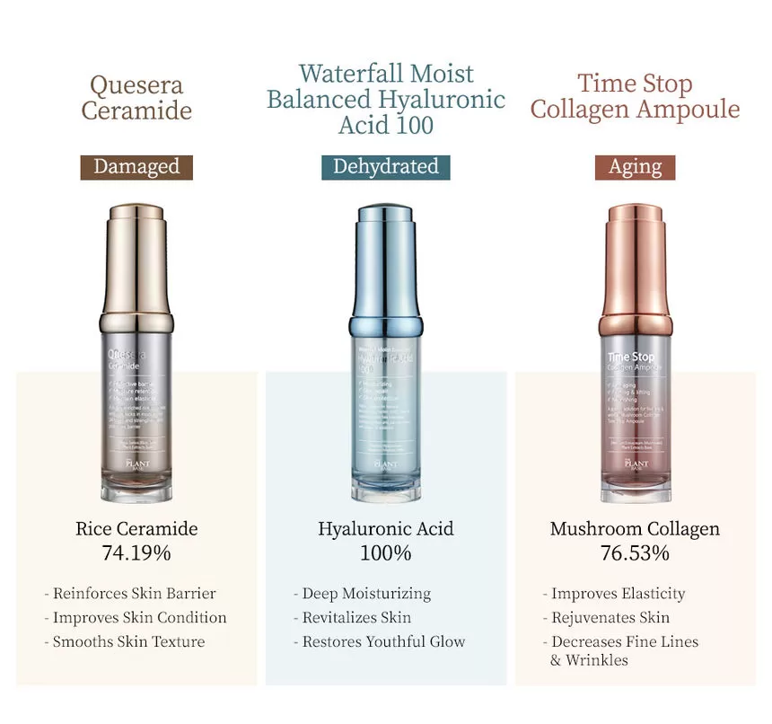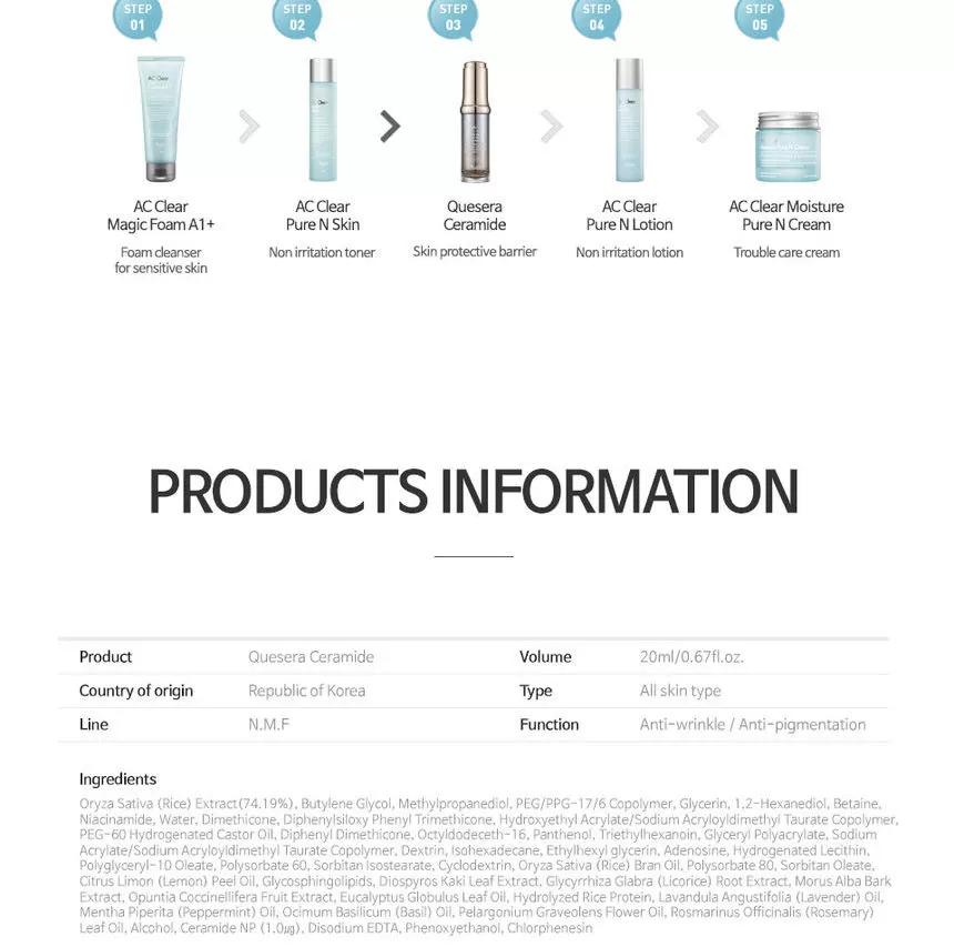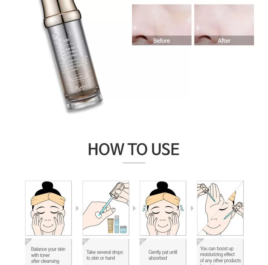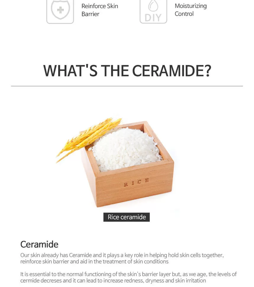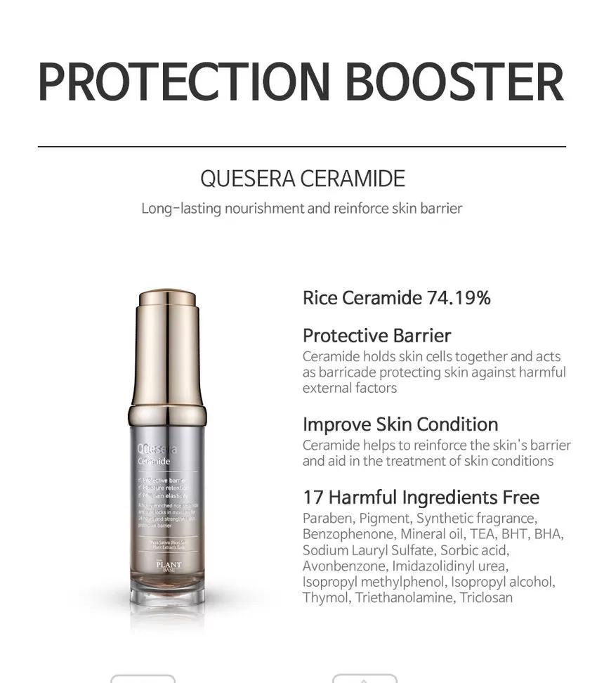 The Plant Base Quesera Ceramide inneholder 74,19% ris ceramide, kolesterol og fettsyrer som beskytter den ytterste hudlaget (epidermis) og spiller en stor rolle i å styrke den naturlige hudbarrieren. Ris frø vann er rik på vitamin B1, P, K og Glutamin syre som gjør huden myk og jevner ut hudtonen. Riskli olje hydrerer huden og fungerer som en antioksidant, riskli olje har blitt brukt som medisin i Japan på grunn av sin spesielle ingrediens Oyrzanol. Denne er utviklet for sensitiv hud og hjelper huden på en naturlig måte reparere skader. Brukes etter rens og toner (kan brukes sammen med toner), kan også tilsettes andre hudpleie og kosmetikk produkter.