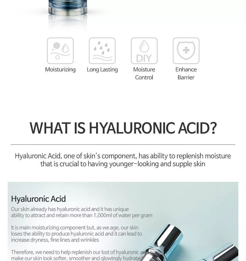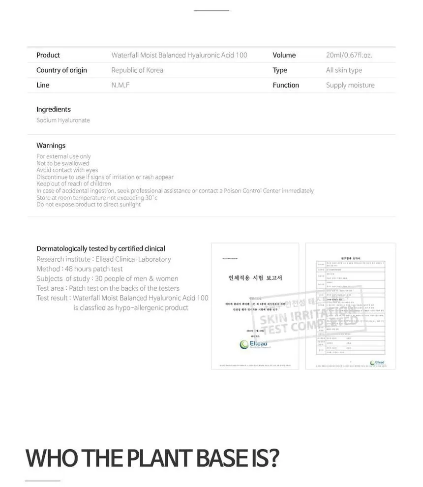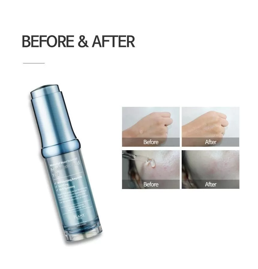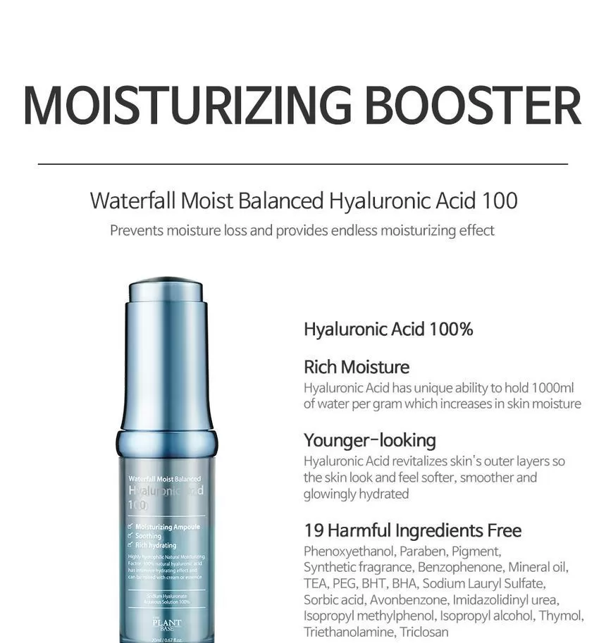 The plant Base Waterfall Moist Balanced Hyaluronic Acid 100 er 100% Hyaluronsyre. Hyaluronsyre finnes naturlig i kroppen og har en fuktighetsbindende egenskap som gjør at den opprettholder hudens struktur og fuktbalanse. Denne ampoulen kan brukes alene etter rens og toner, eventuelt sammen med andre hudpleieprodukter eller kosmetikk for en ekstra fuktighetsboost.