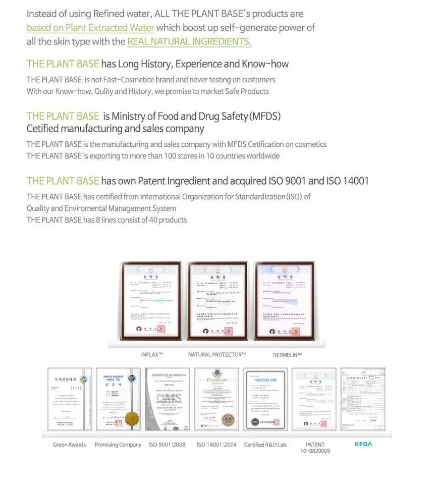 Etablert i 2005, The Plant Base ble raskt populær med sine 100% naturlige håndlagde såper. Med et ønske om å lage naturlig hudpleie og kosmetikkprodukter egnet for familiebruk, dyrker varemerket kontinuerlig hypoallergene og høykvalitetsprodukter, The Plant Base er i dag en av de ledende kosmetikk og hudpleiemerkene i Korea. Alle produkter er 100% laget i Korea og er Cruelty-Free.