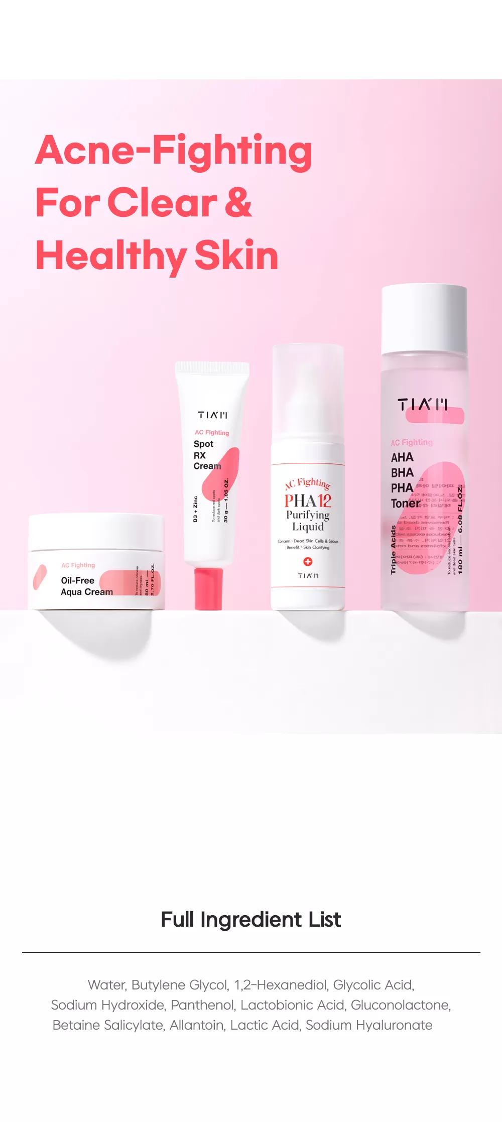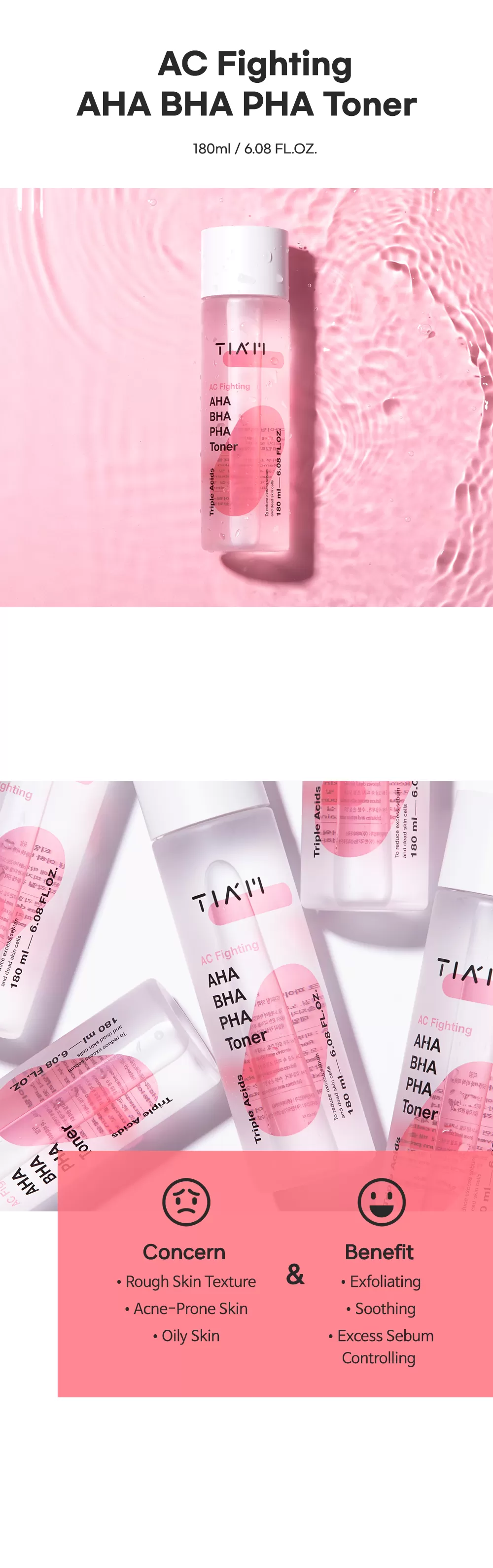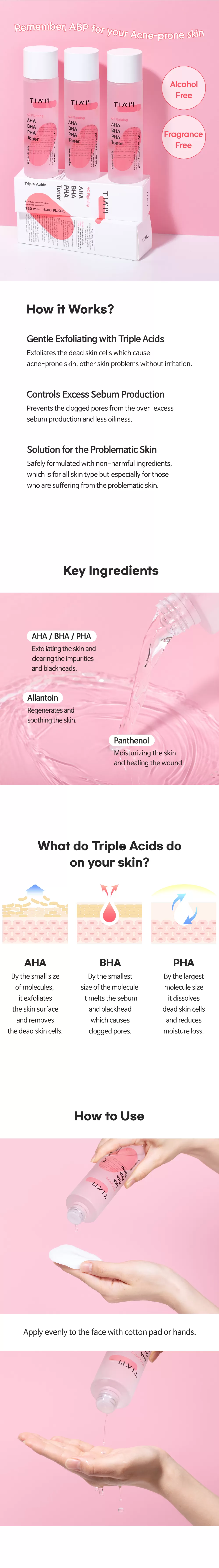 Tiam AC Fighting AHA BHA PHA Toner er en eksfolierende toner som fjerner døde hudceller takket være AHA. reduserer overflødig talgproduksjon grunnet BHA. PHA vil eksfoliere huden og hjelper den å holde på fuktigheten. Inneholder i tillegg Allantoin som hjelper huden å regenerere og har en beroligende effekt, Panthenol vil fukte huden og har en helbredende effekt på irritert hud.