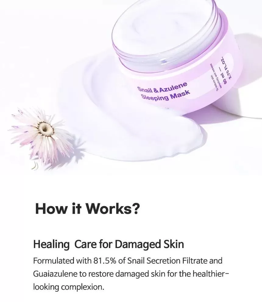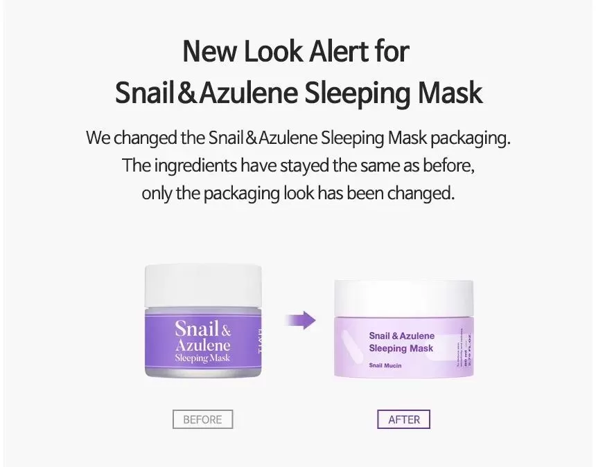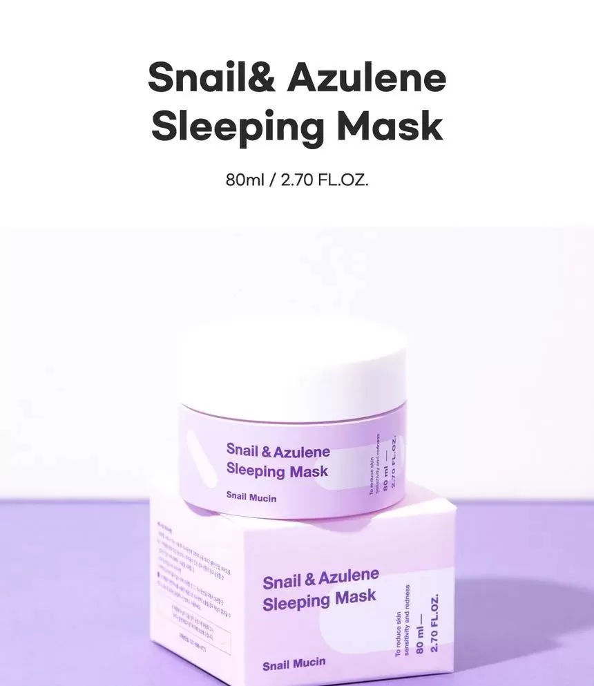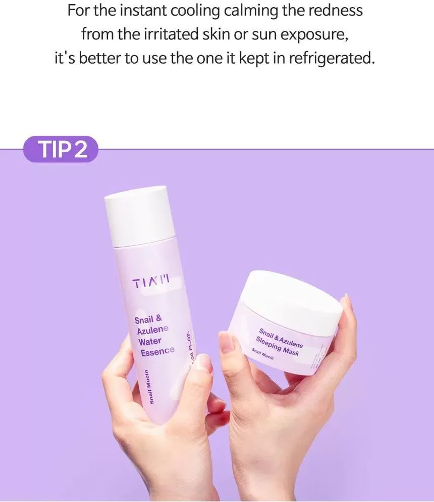 Tiam Snail & Azulene Sleeping Mask er en behagelig og effektiv sovemaske som inneholder 85 prosent sneglesekret og azulene fra kamilleblomsten, denne sovemasken vil tilføre huden rikelig med fukt, redusere fine linjer, styrke hudbarrieren og berolige irritert hud.