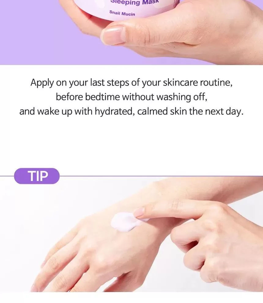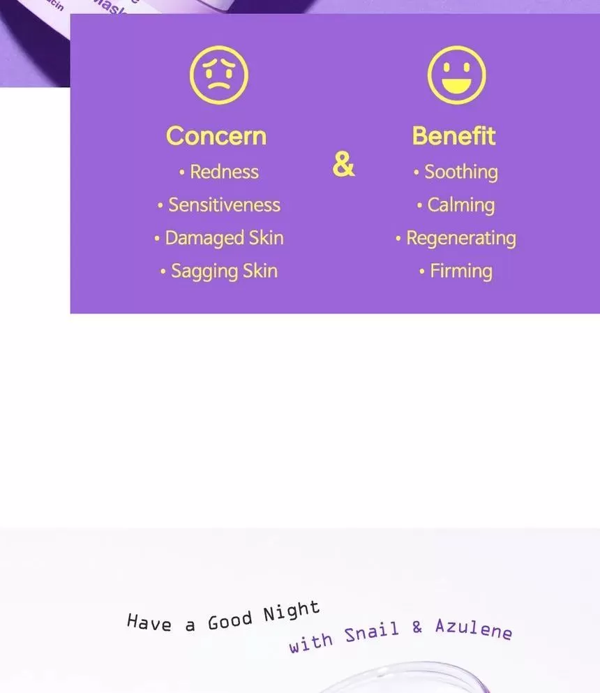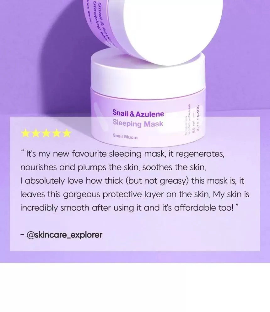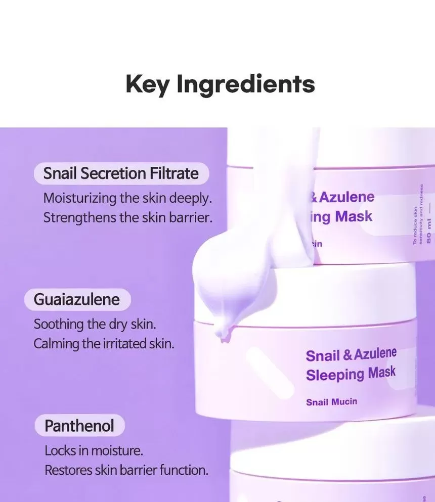 Tiam Snail & Azulene Sleeping Mask er en behagelig og effektiv sovemaske som inneholder 85 prosent sneglesekret og azulene fra kamilleblomsten, denne sovemasken vil tilføre huden rikelig med fukt, redusere fine linjer, styrke hudbarrieren og berolige irritert hud.