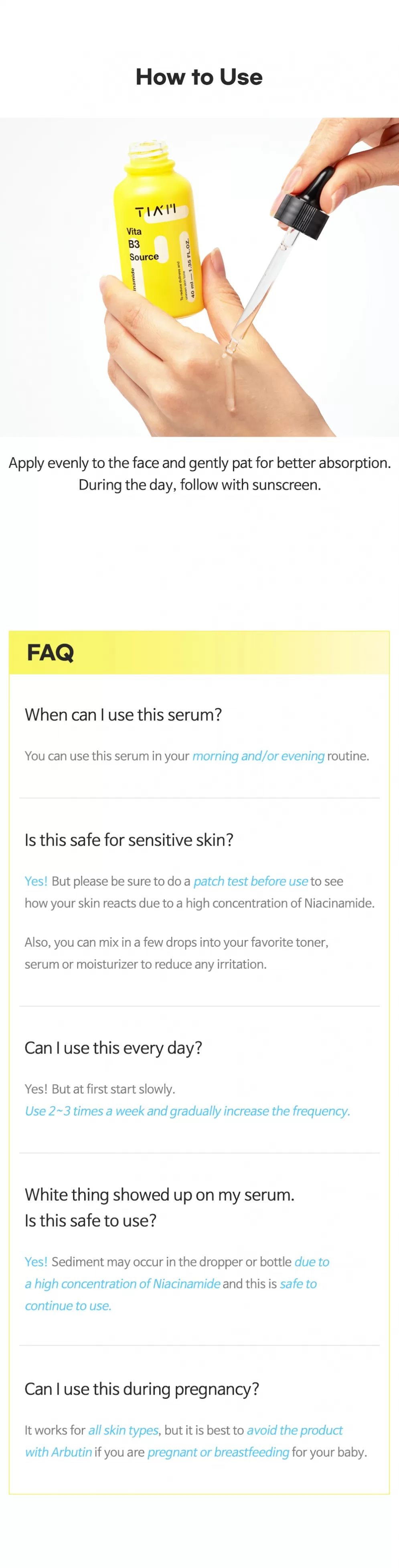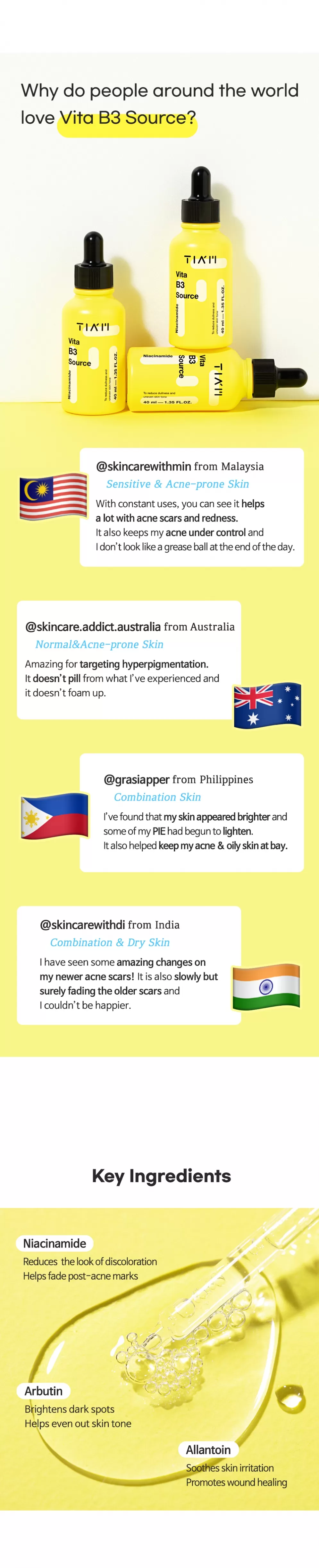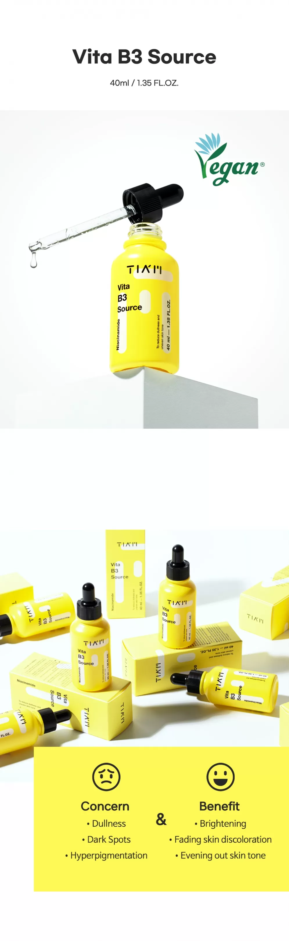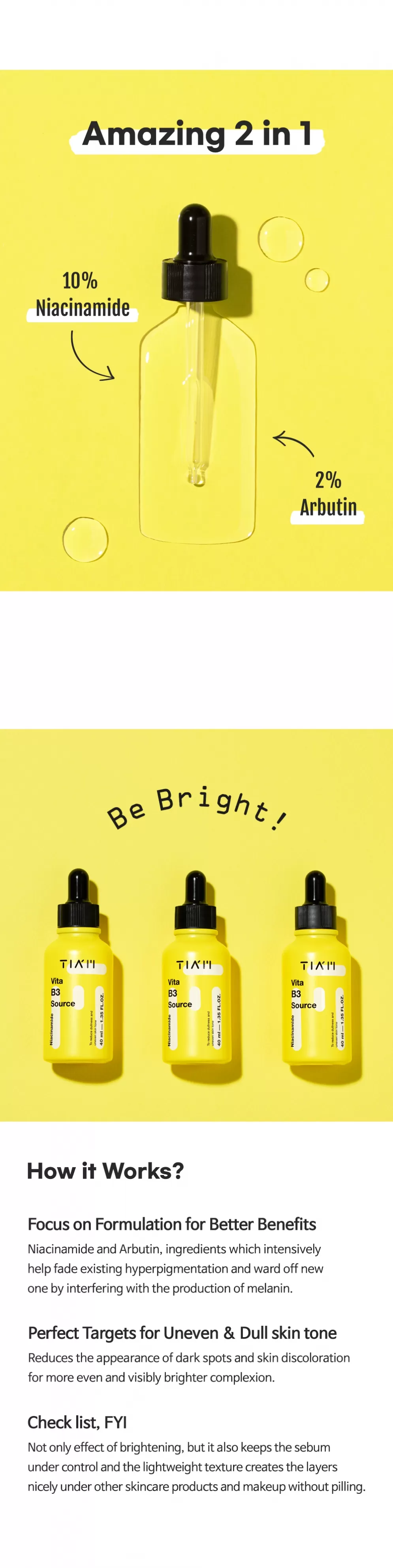 TIA'M Vita B3 Source er et effektivt serum utviklet for å lysne hudtone, redusere pigmentflekker og gi en jevnere hudoverflate. Med 10 % niacinamid og 2 % arbutin er det et målrettet steg for hud med ujevn tone eller misfarging.